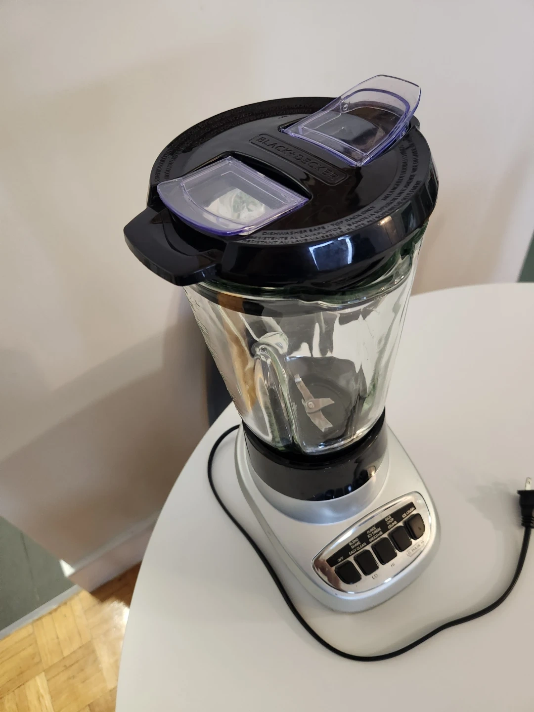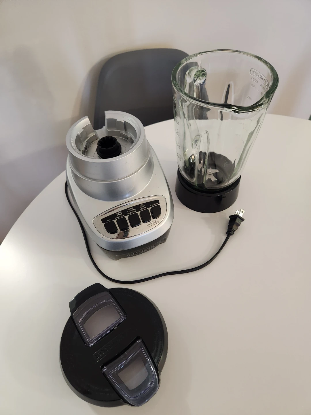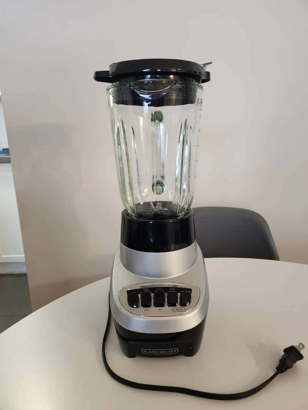 Selling a Black+Decker blender. It comes with the blender base, glass jar, and lid. It has multiple settings like "easy clean", "smoothie", and pulse settings for different blending needs