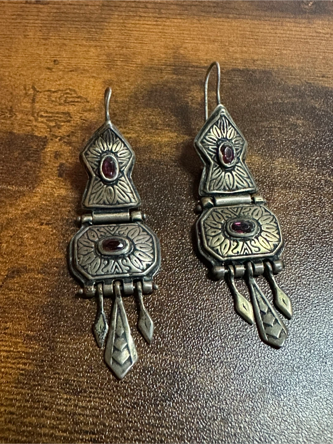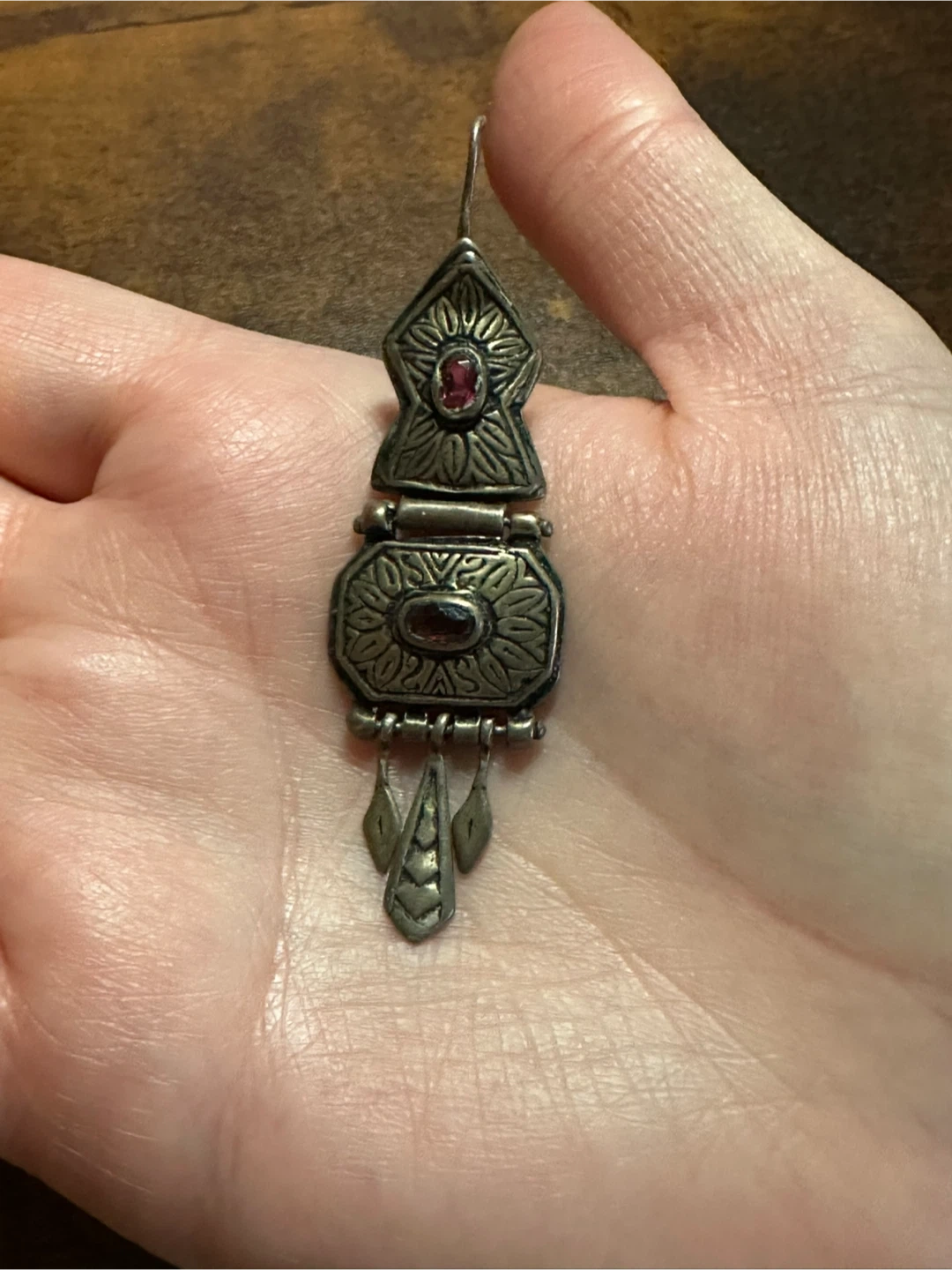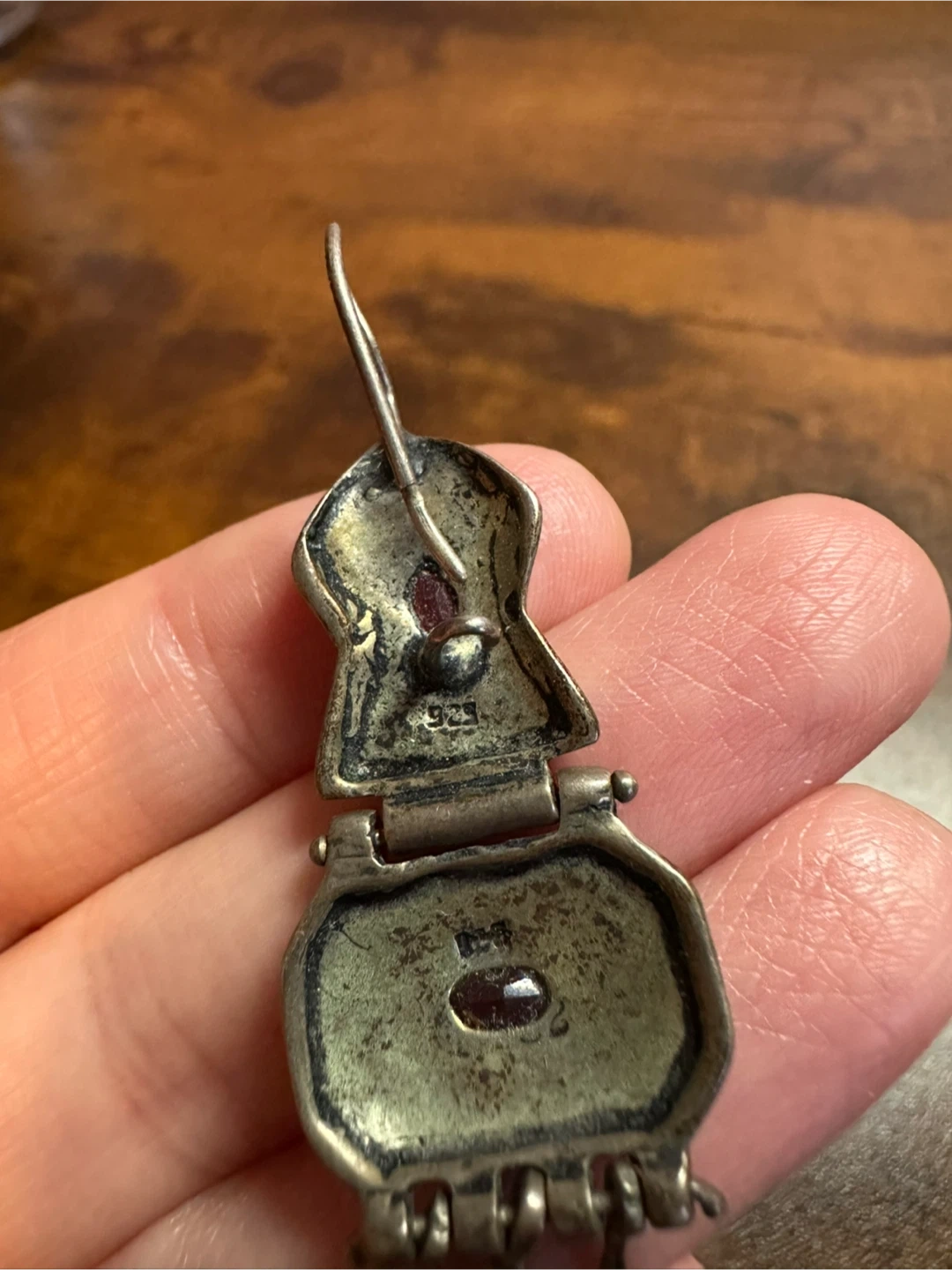 These are vintage sterling silver earrings (marked with 925) and decorated with red stones. I doubt the stones are anything crazy in value, but I know nothing about them. These earrings have been in my husband’s grandmother’s jewelry box for years and we are trying to declutter.