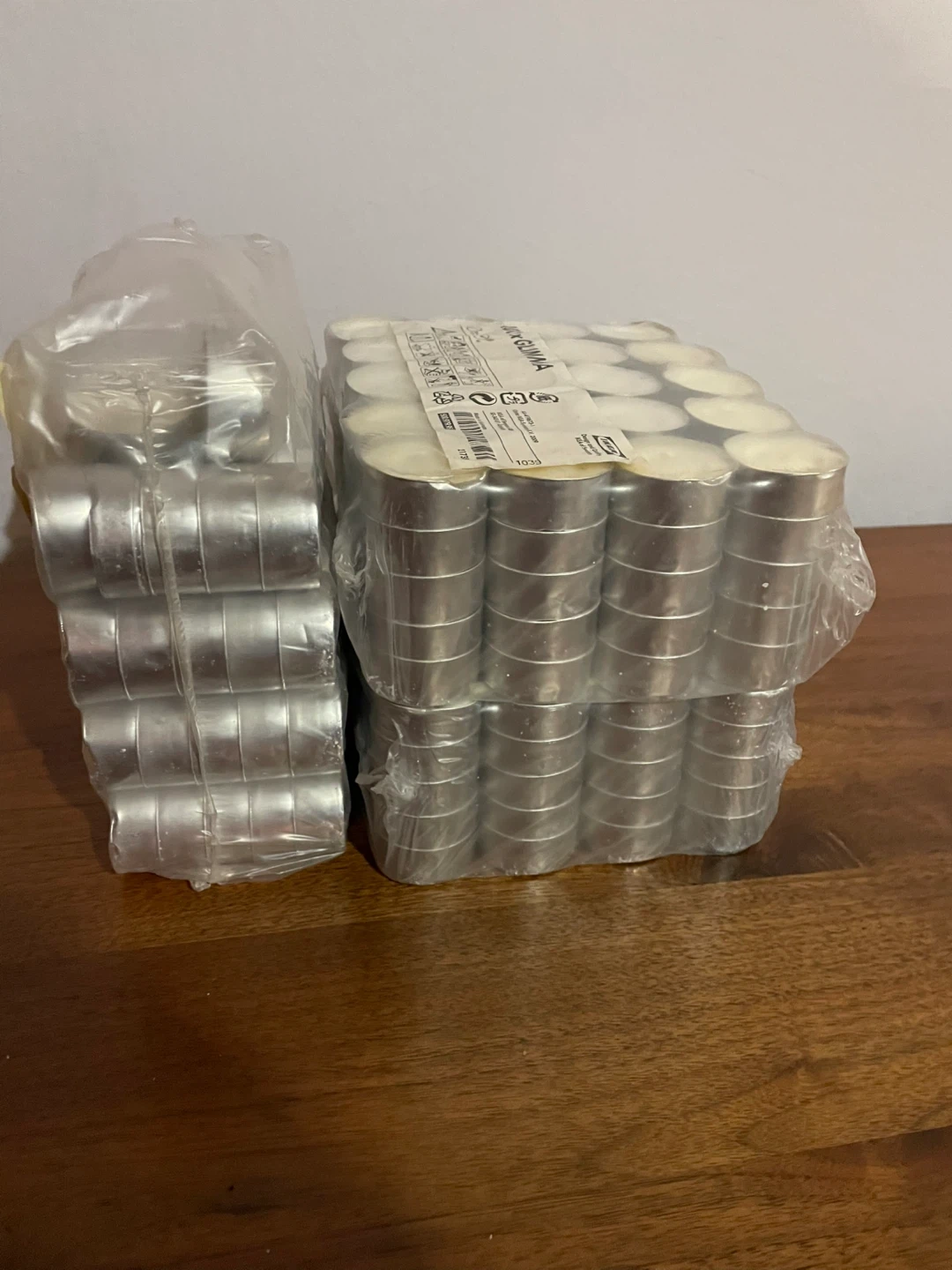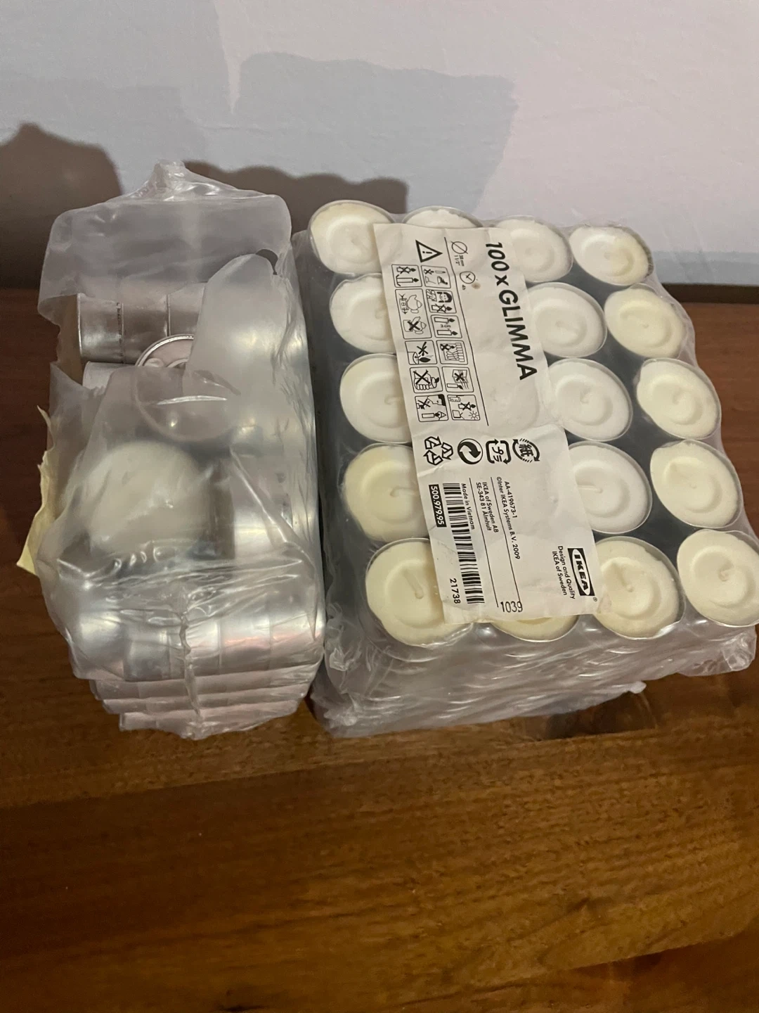 Selling 2 and a half packs of IKEA GLIMMA unscented tealight candles. Each pack contains 100 candles. Perfect for creating a cozy atmosphere in your home!