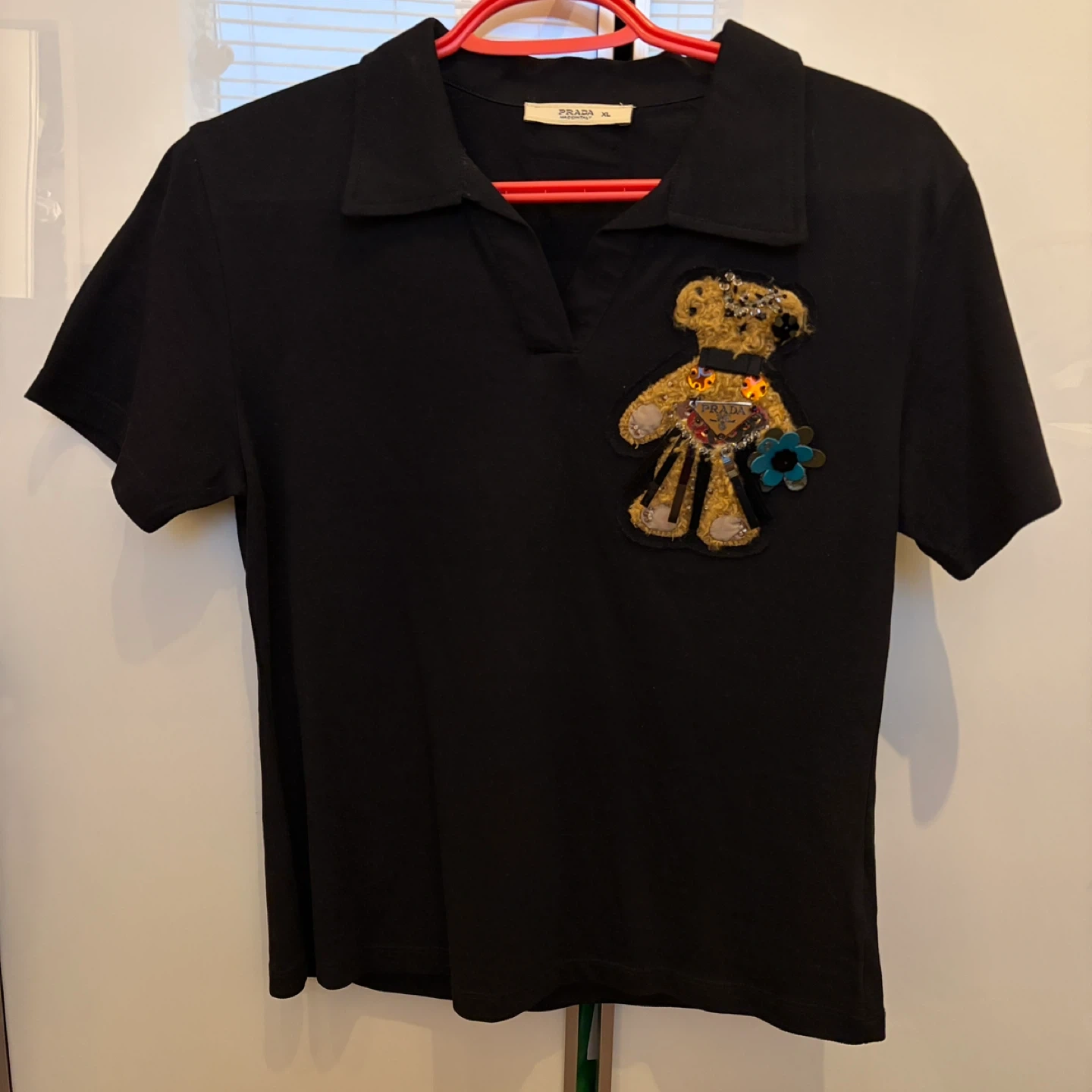 Selling my mom’s Prada Black Teddy Bear Polo Shirt in Kids size XL (fits like Women’s XS)! There’s signs of wear but it’s still in great condition. This shirt is made of 100% cotton and made in Italy
