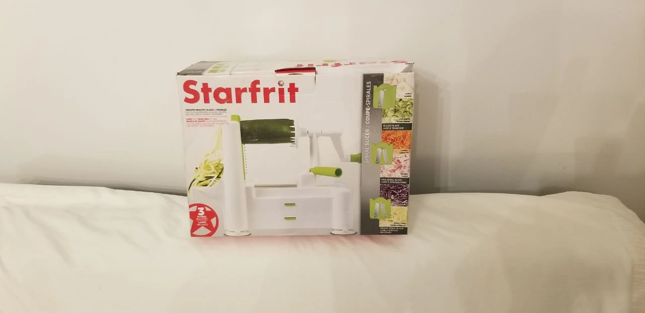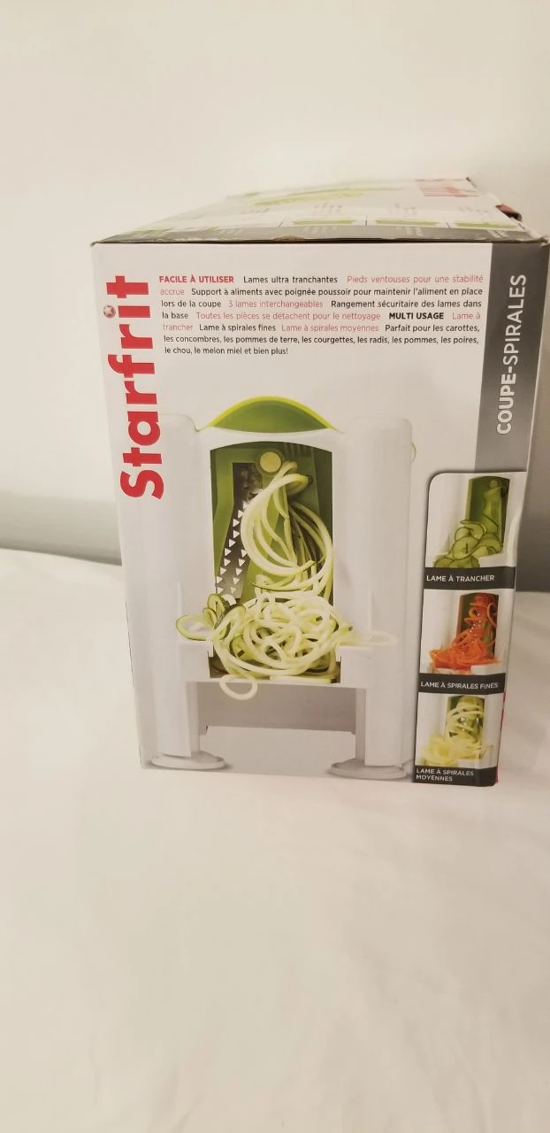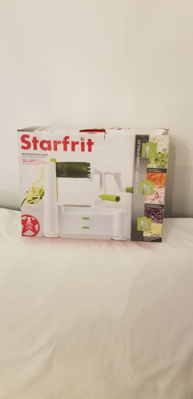 I'm selling a brand new Starfrit Spiral Slicer still in its original box! This slicer is perfect for creating healthy veggie noodles and includes 3 blades for different cuts. It's easy to use with ultra-sharp blades and suction feet for stability. Get creative with your cooking!