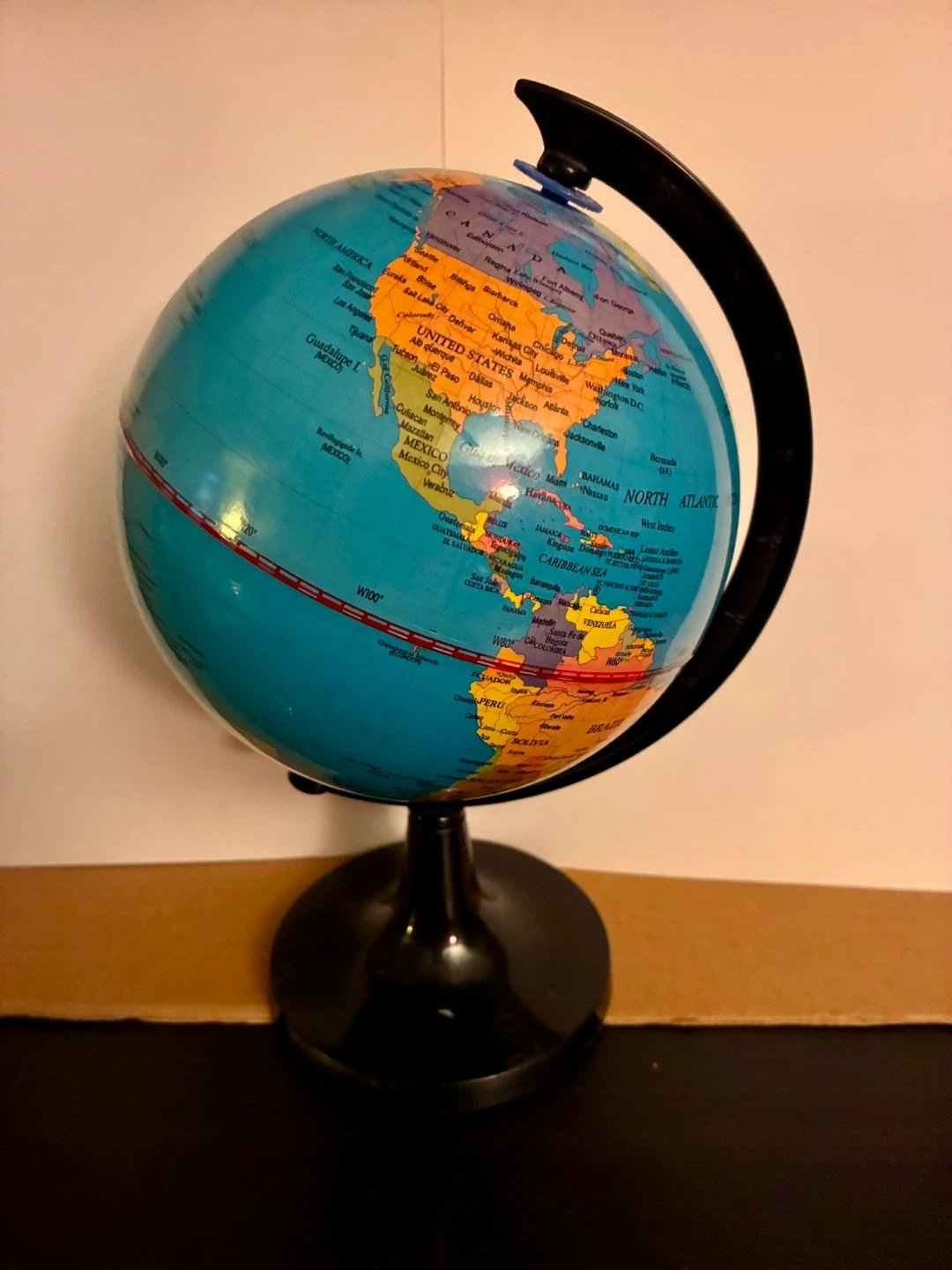 Selling a world globe in great condition. Globe is about six inches in diameter; holder is about nine inches top to bottom.