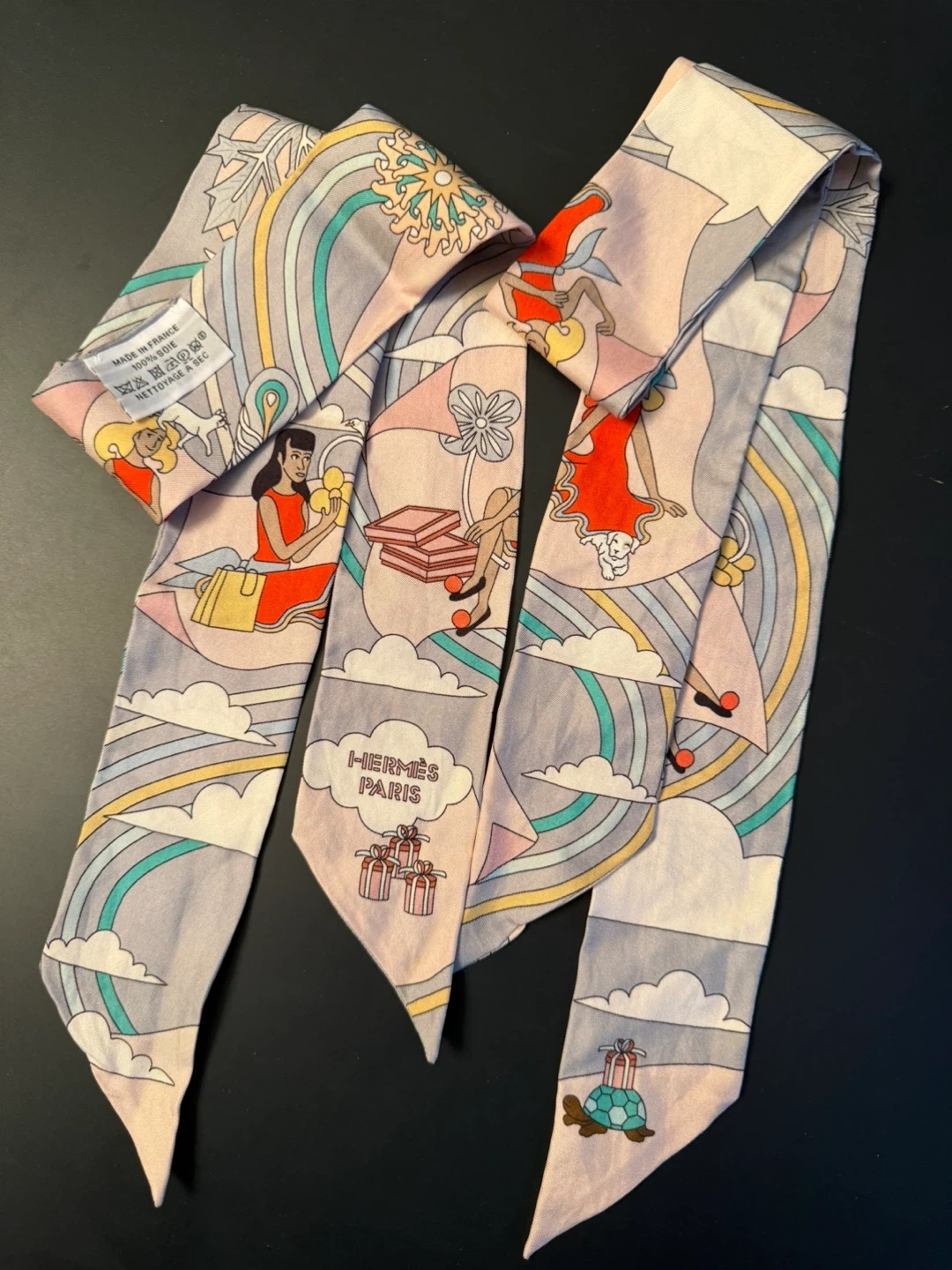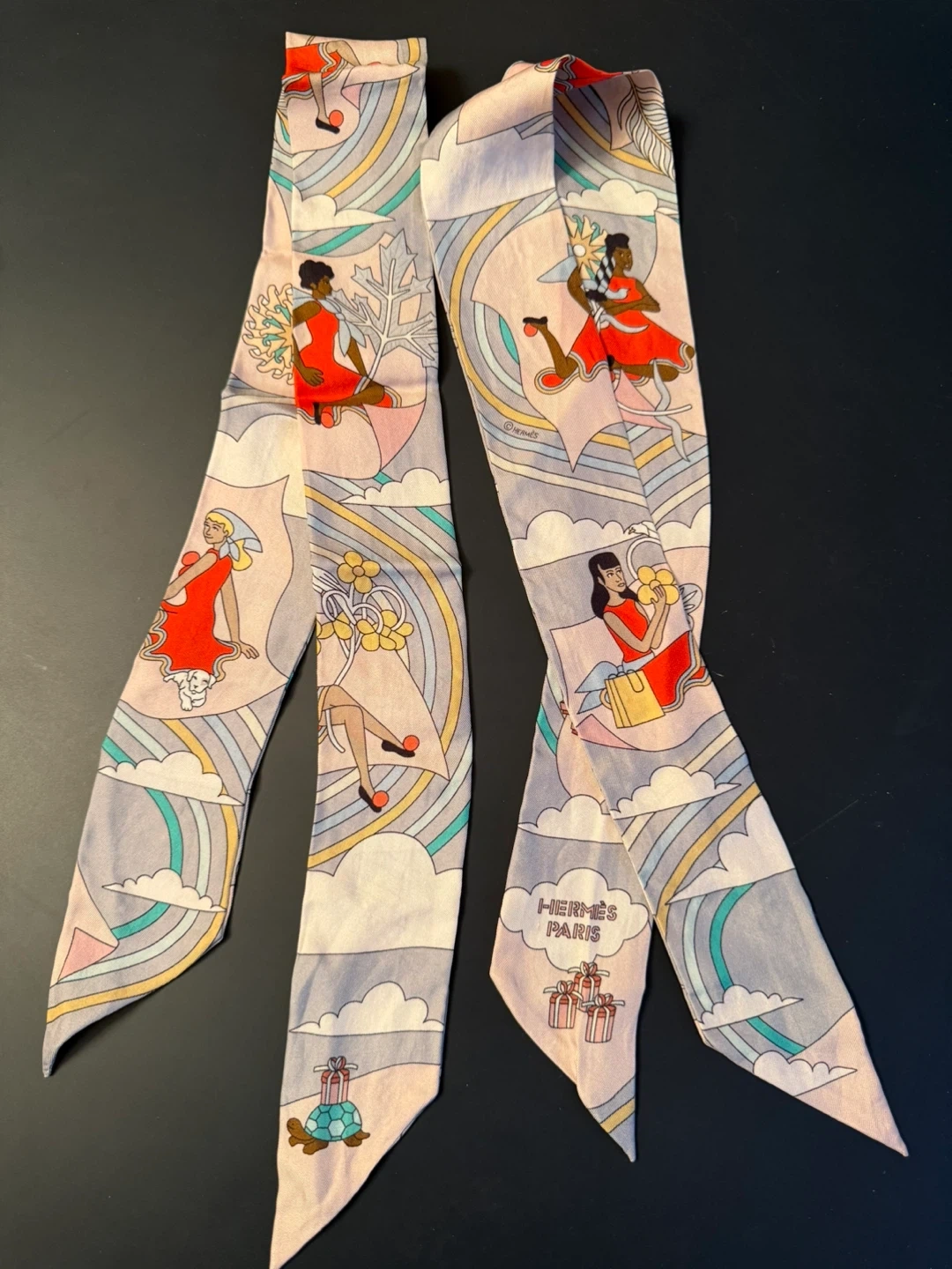 Selling a lovely silk twilly scarfs ! It features a fun and colourful design with various figures and motifs. The scarf is 100% silk. It's in great condition and would make a stylish addition to any outfit or use it for a bag handle wrap.