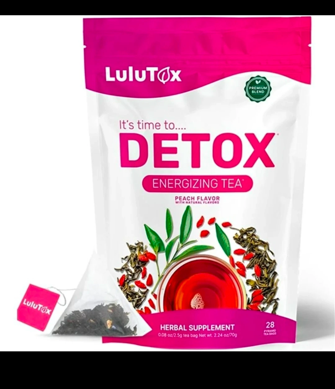 It's time to detox with LuluTox Energizing Tea! This herbal supplement comes in a peach flavour with natural flavours. Each bag contains 0.08 oz/2.5g of tea, with a net weight of 2.24 oz/70g. You'll get 28 pyramid tea bags in total