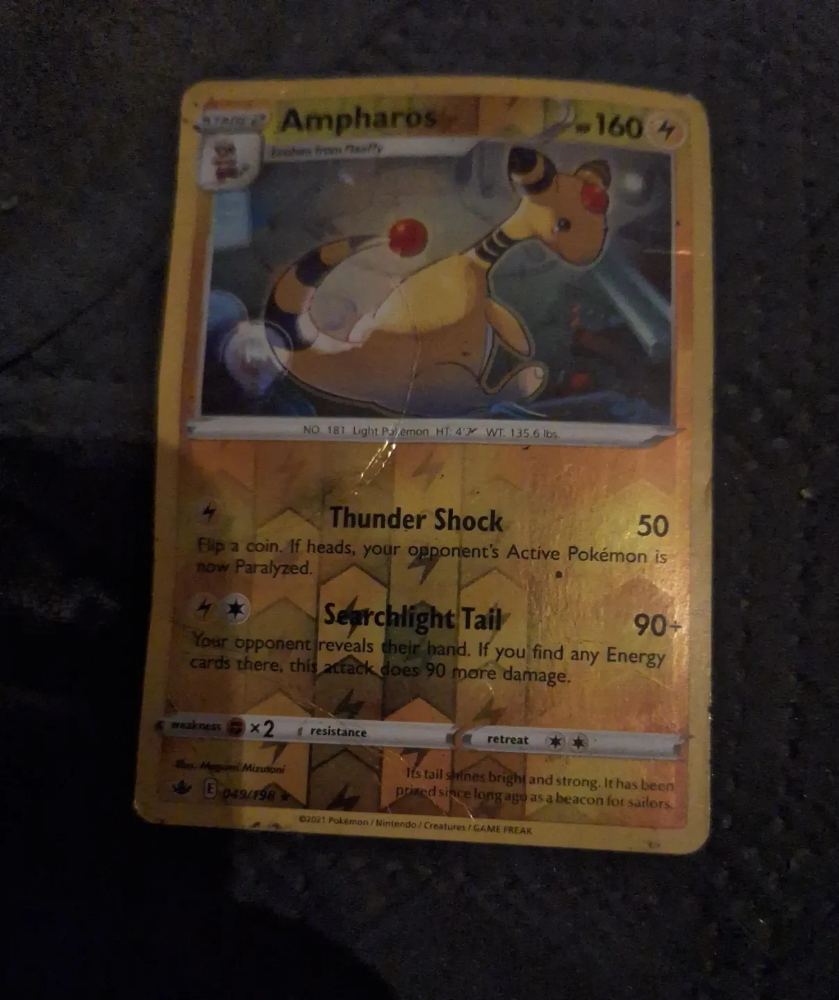 Selling an Ampharos Pokemon card. It has Thunder Shock and Searchlight Tail attacks. Its tail shines bright and strong and has been prized since long ago as a beacon for sailors
