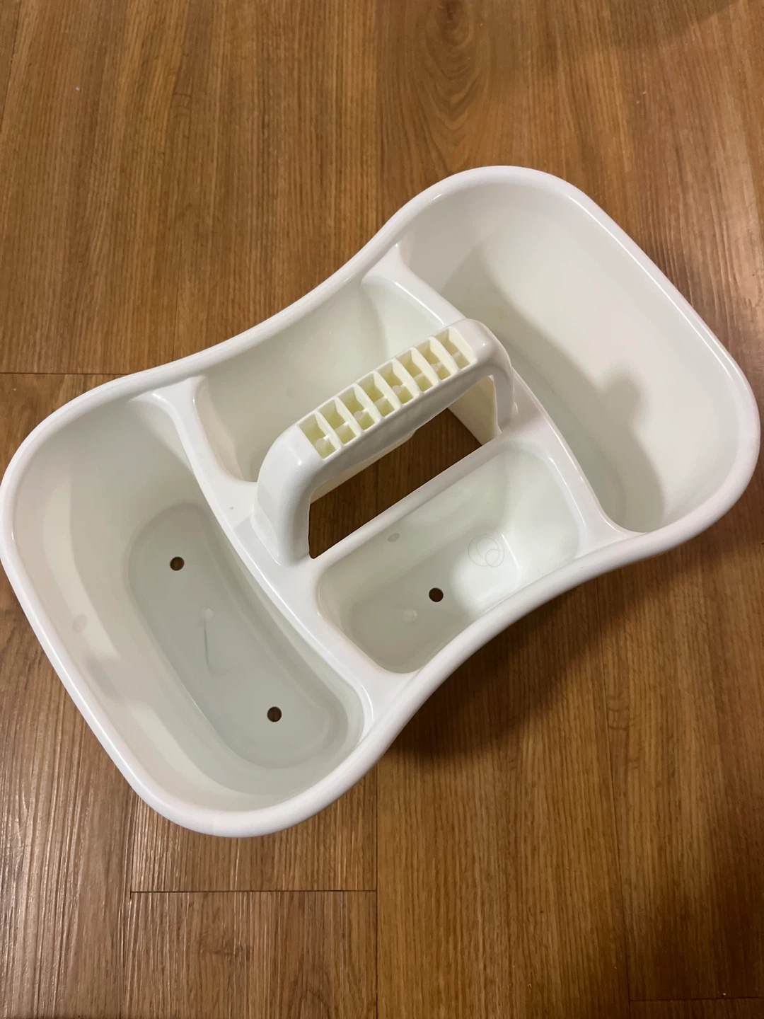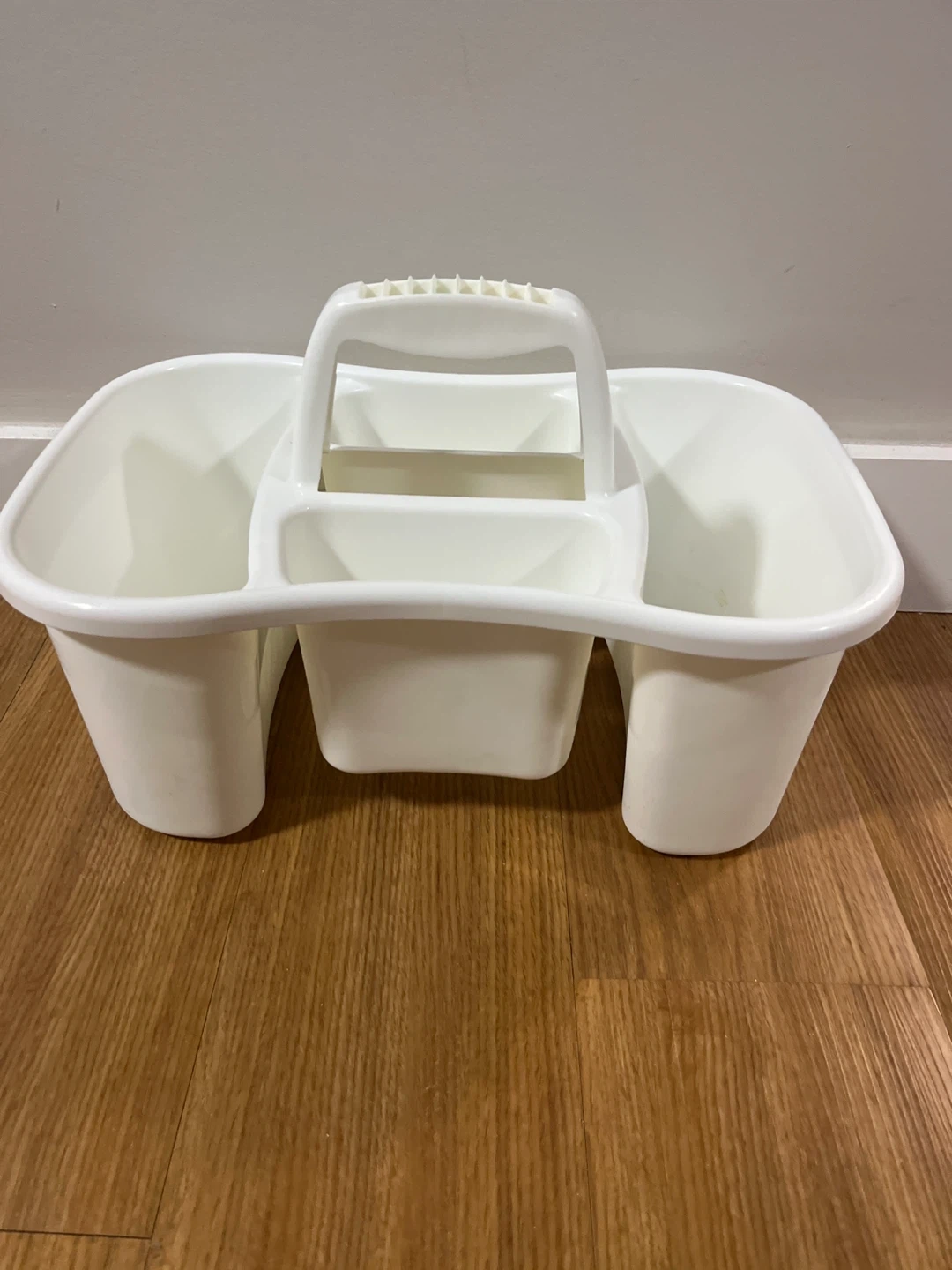 Here's a handy white plastic organizer caddy. It's perfect for keeping things tidy around the house.