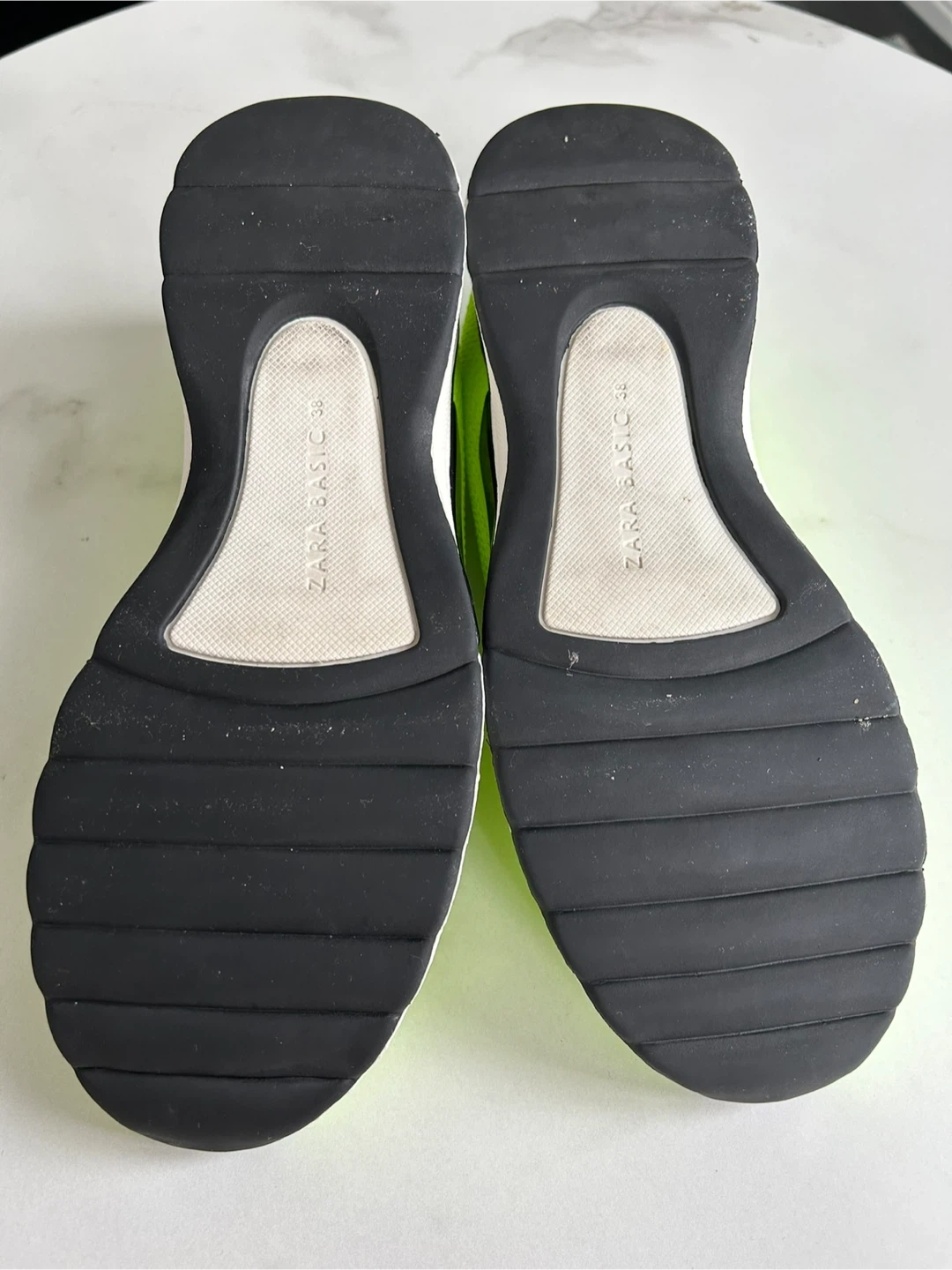 These Zara slip-on sneakers are a vibrant neon green! size 7.5. These shoes are perfect for adding a pop of colour to any outfit