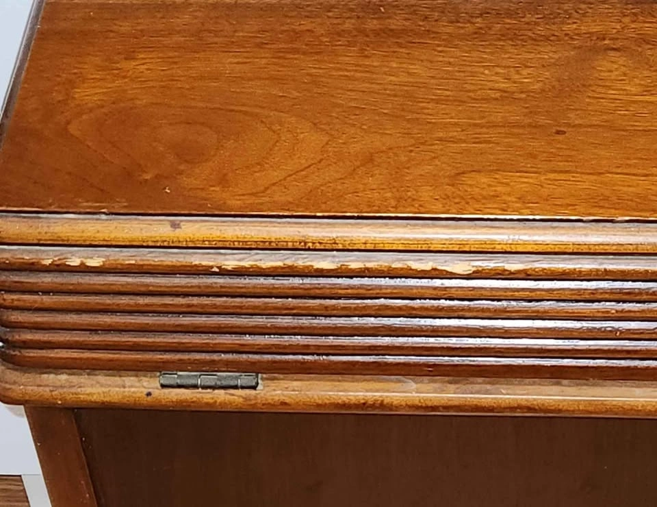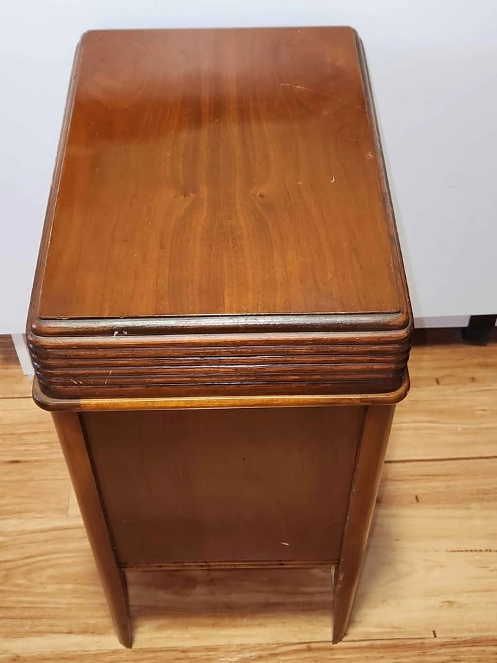 Wooden sewing cabinet in the Art Deco style from the 1940s. Features a hinged top compartment with thread storage, two drawers, and grooved detailing. Dimensions are approximately 24 inches in height, 13 inches in width, and 10.5 inches in.