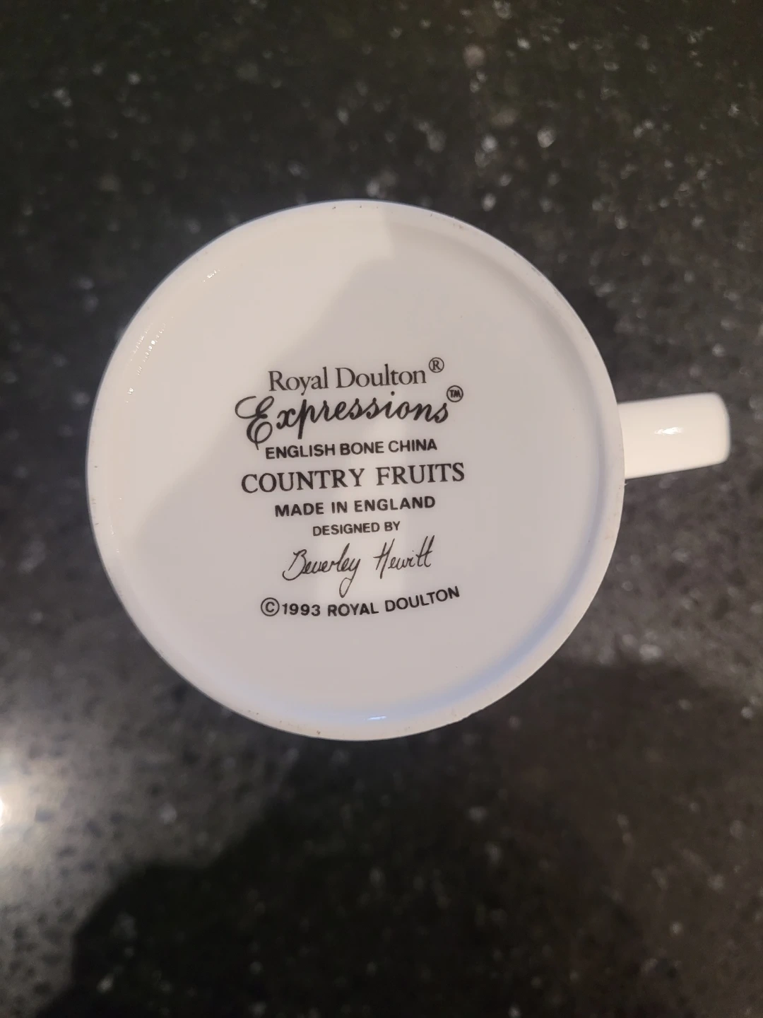 I'm selling a Royal Doulton Expressions mug from the Country Fruits collection! It's made of English bone china and features a lovely fruit design. Designed by Beverley Hewett, this mug was made in England in 1993. Perfect for adding a touch of vintage charm to your kitchen