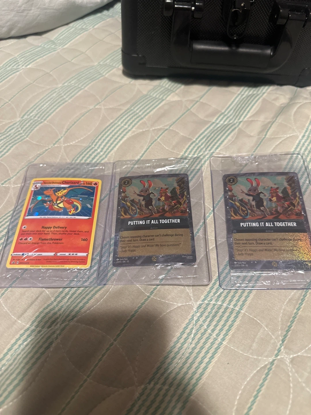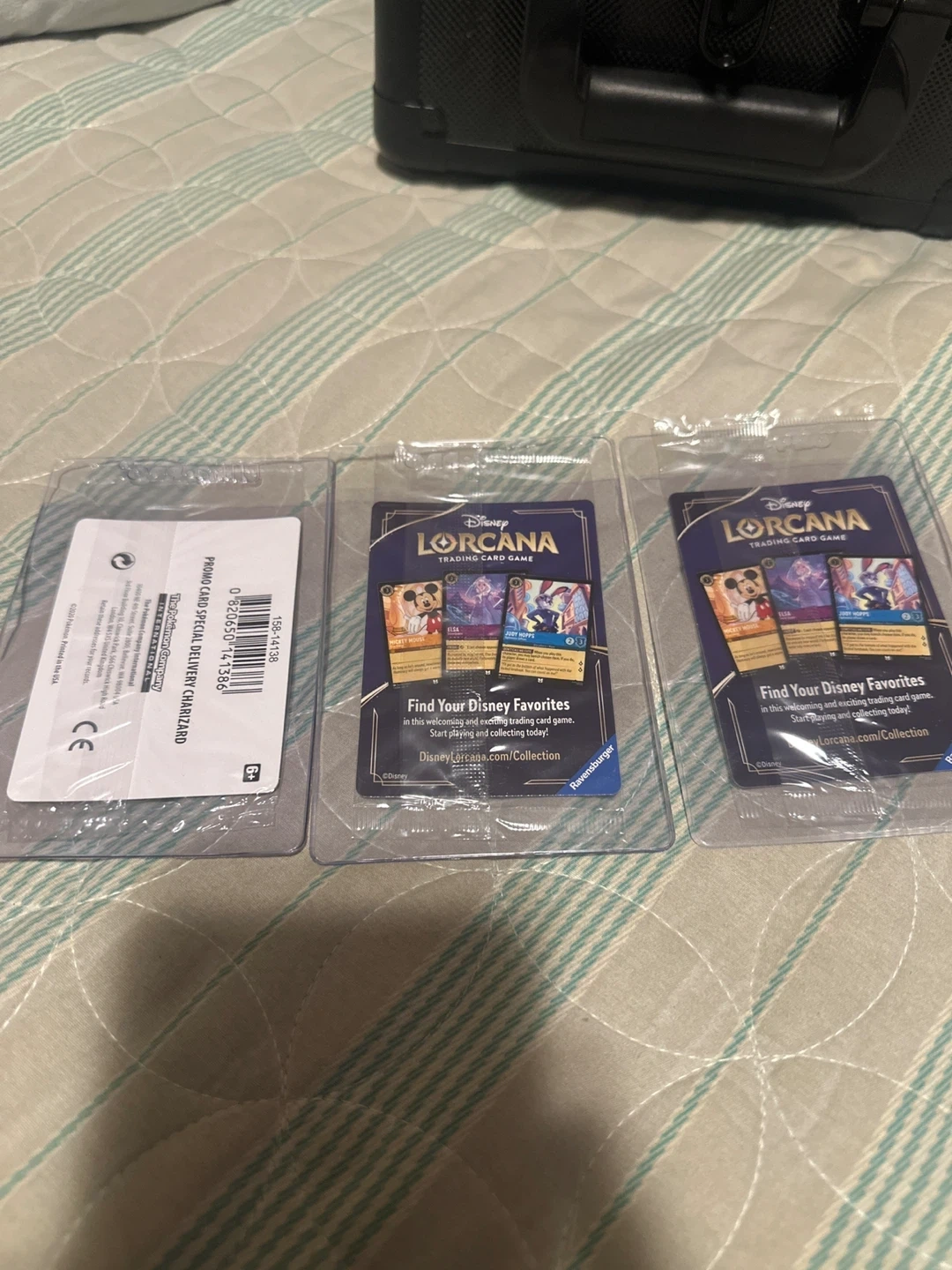 Selling a special delivery Charizard (sealed) and a few Disney Lorcana trading cards. They're in great condition and ready for a new owner! Perfect for any Disney or trading card fan.