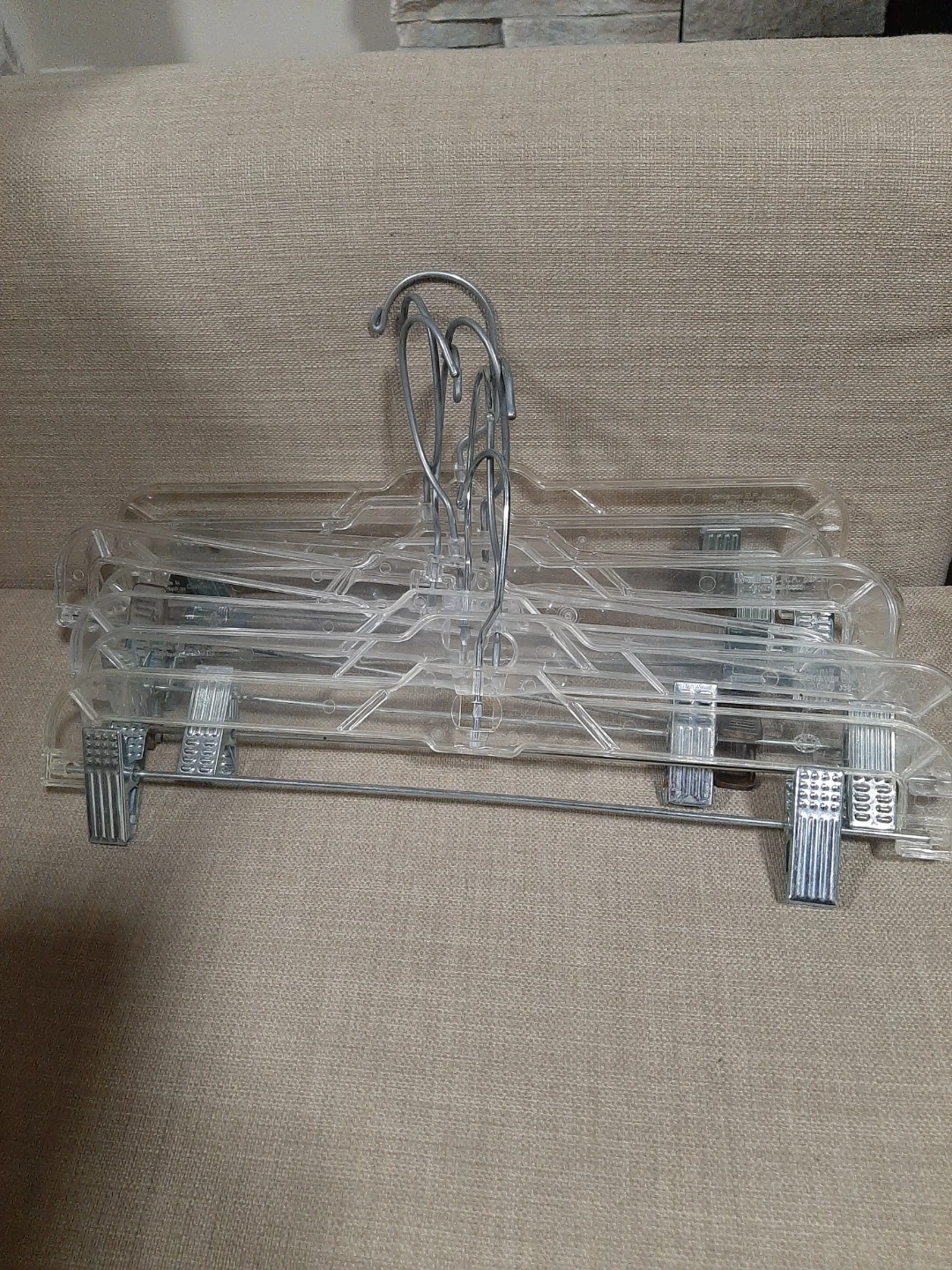 Selling 8pcs of pants/skirt hangers. They are clear and in great condition. Perfect for keeping your closet organized!