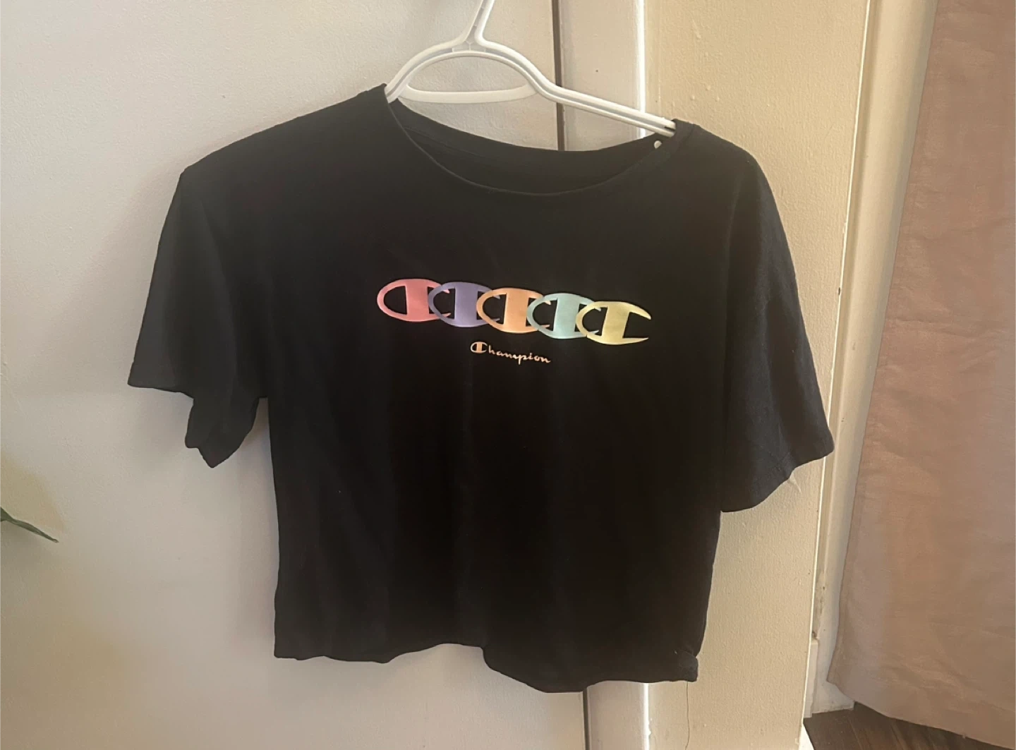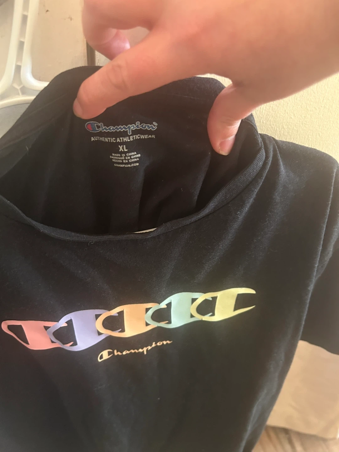 A Champion black t-shirt, size XL, featuring a colourful logo design. It's in great condition!