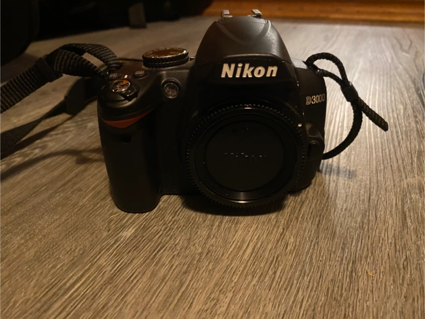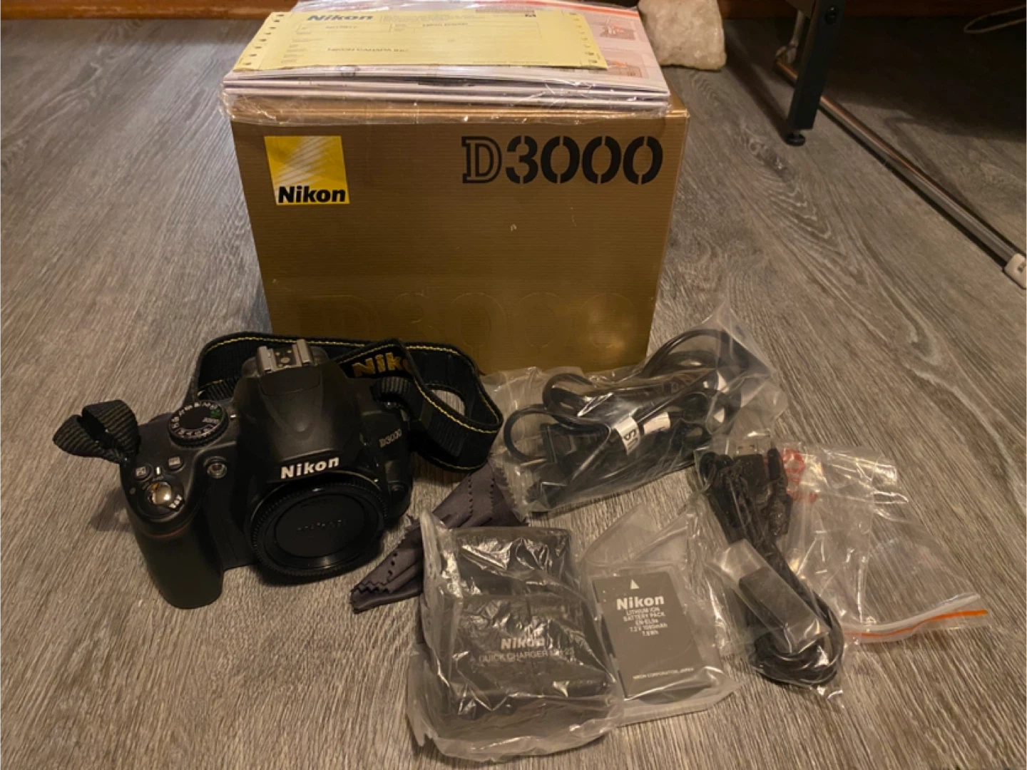 . Nikon D3000 camera body, battery, charger, lens cloth, USB cable