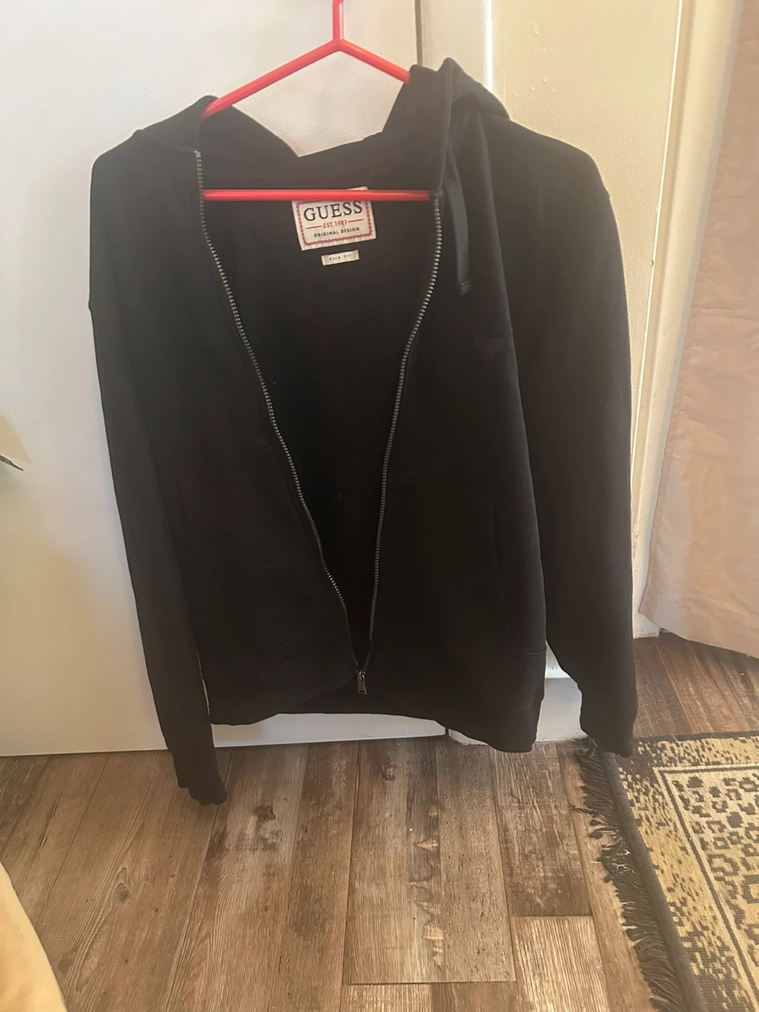 Selling a Guess slim fit hoodie in black. It's in great condition and ready for a new owner!