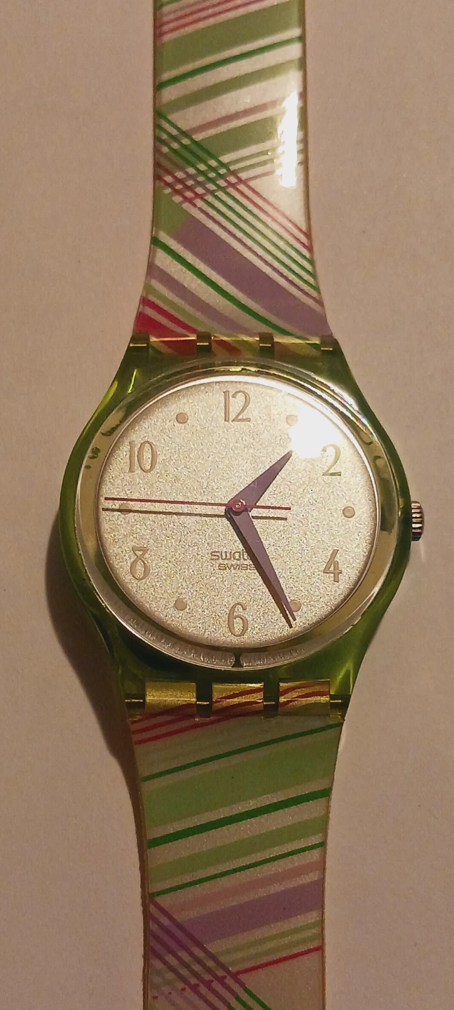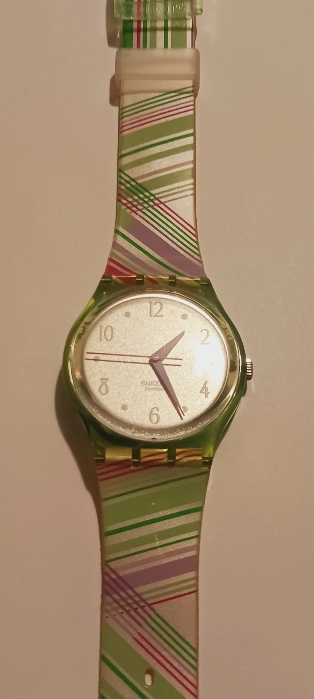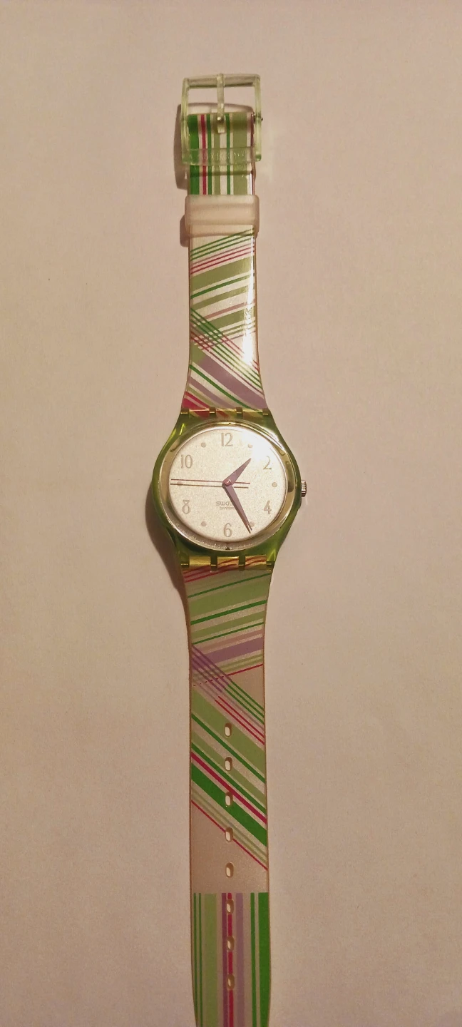Rare Vintage 2004. Swatch CHLOROPHYLL Swiss Watch. Excellent condition, but needs a new battery !! Swiss watch with a fun striped band! The watch face is a light color and the band features green, white, and purple stripes. It's in great condition, but needs a new battery. Selling as is. 9" long. ALL MY PRICES ARE NEGOTIABLE !!