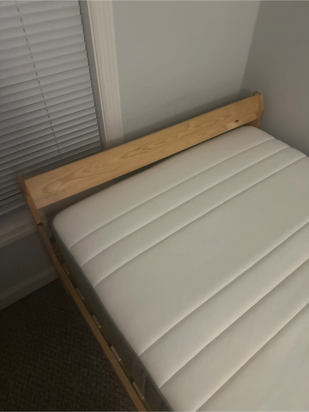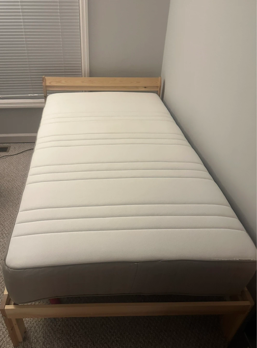 Selling a twin bed frame with a mattress. It's in good condition and ready for a new home. Perfect for a guest room or a child's room