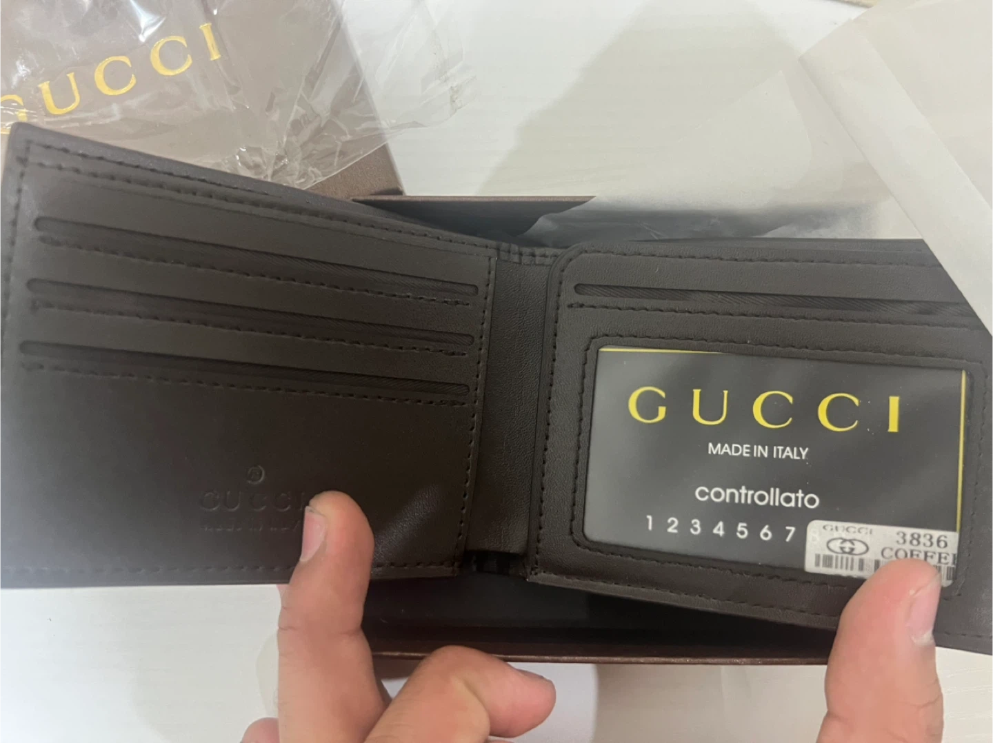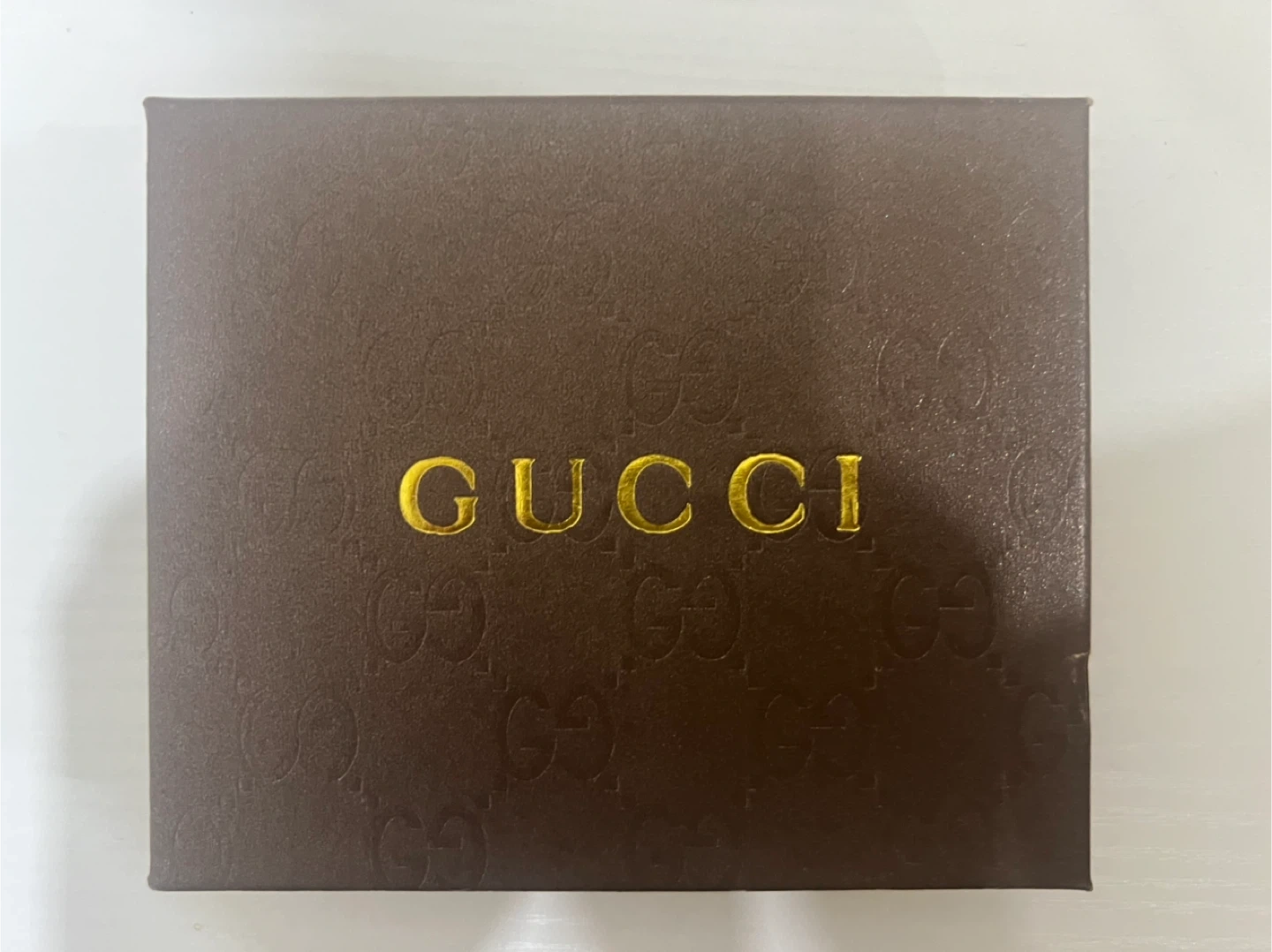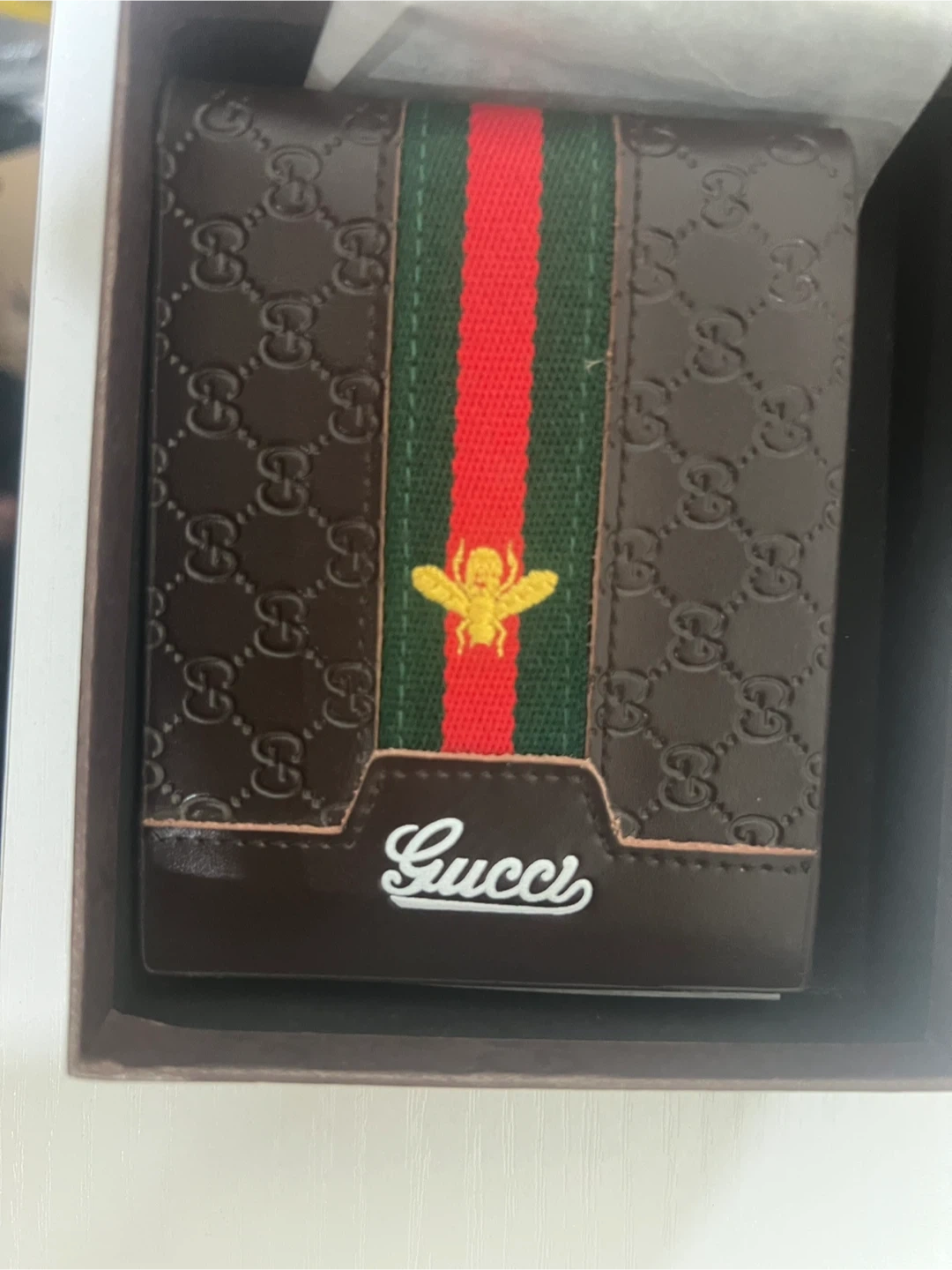 Selling a stylish Gucci wallet! It's a beautiful brown colour and comes with its original box. The wallet features the classic Gucci design and is made in Italy. It has a red and green stripe with a bee design. A great accessory to keep your cards and cash organized