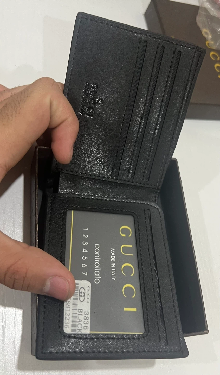 Selling a Gucci black leather wallet. It comes with the original box. The wallet features the classic Gucci design and is in great condition. Perfect for everyday use or as a gift!
