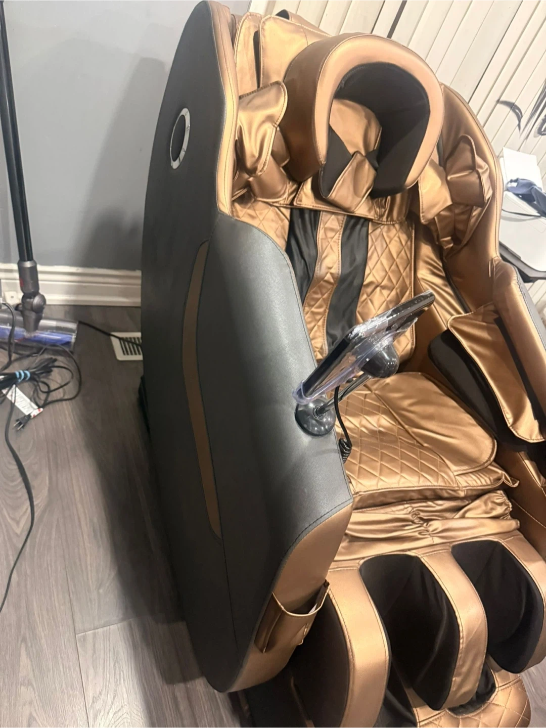 This massage chair has multiple functions including kneading, tuina, strong, leisure, and sleep modes! It also has pressure auto, shoulder arm airbag, seat head airbag, and leg airbag options. You can also adjust the speed and intensity, as well as heat and time your massage and in built Bluetooth speakers also in this
