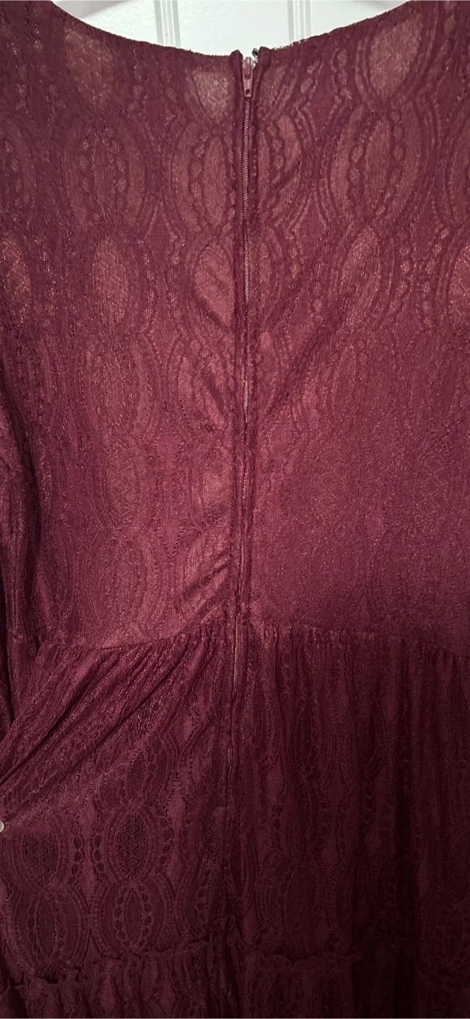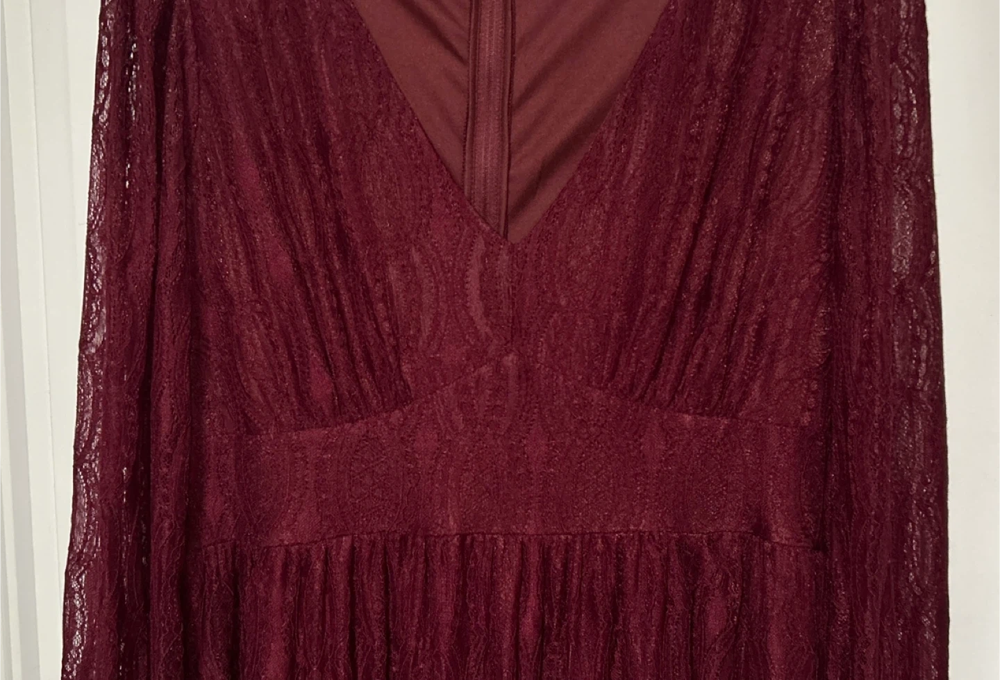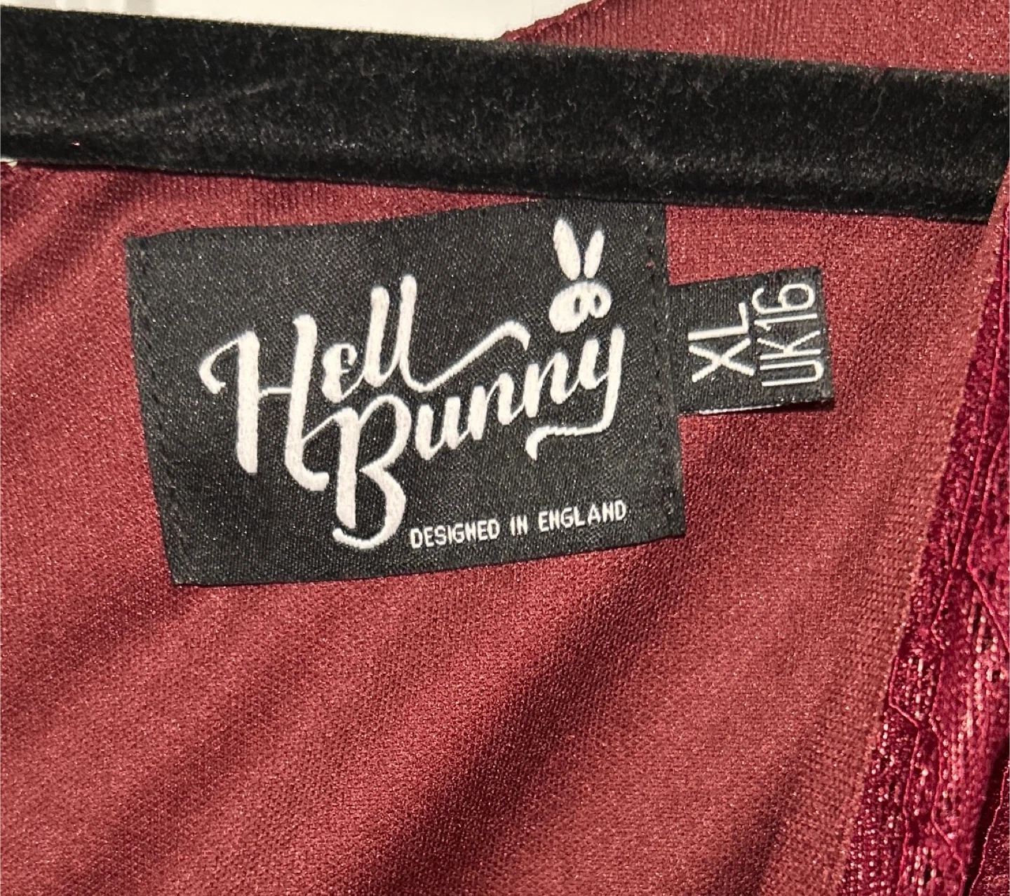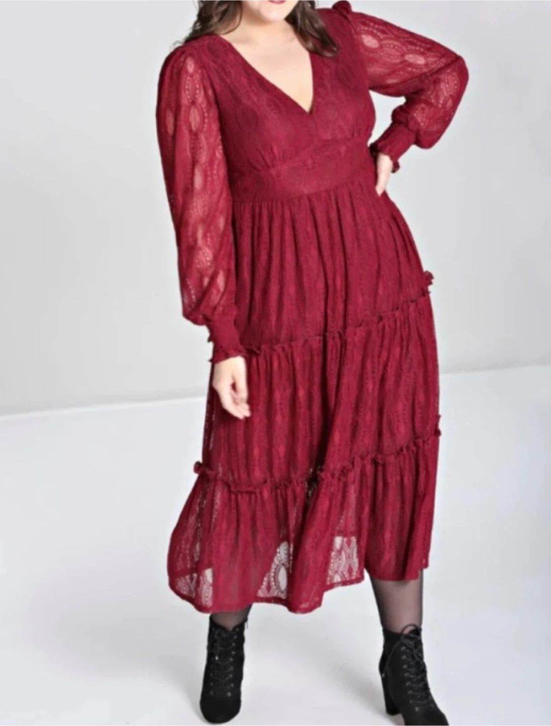 Hell Bunny Available! Beautiful burgundy lace dress from Hell Bunny - XL. The dress features a flirty V-neckline which gathers into the underbust seam to flatter your ‘girls’. Bodice is lined. Full-length puff sleeves gather into shirred cuffs with a dainty frill detail. Gathered layers from the waistline to create a skirt consisting of 3 tiers and frilly panels for even more volume and drama. Skirt lining is to the second skirt frill seam. Centre back zipper travelling mid dress to allow easy fitting. The material is 95% polyester and 5% elastane, so it has a bit of stretch for a comfortable fit! NWOT •Public meet up would be here at Shoppers; 2526 66th Street SW *Cash upon meeting please*