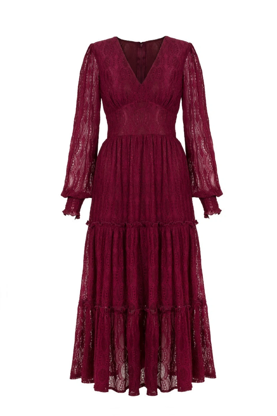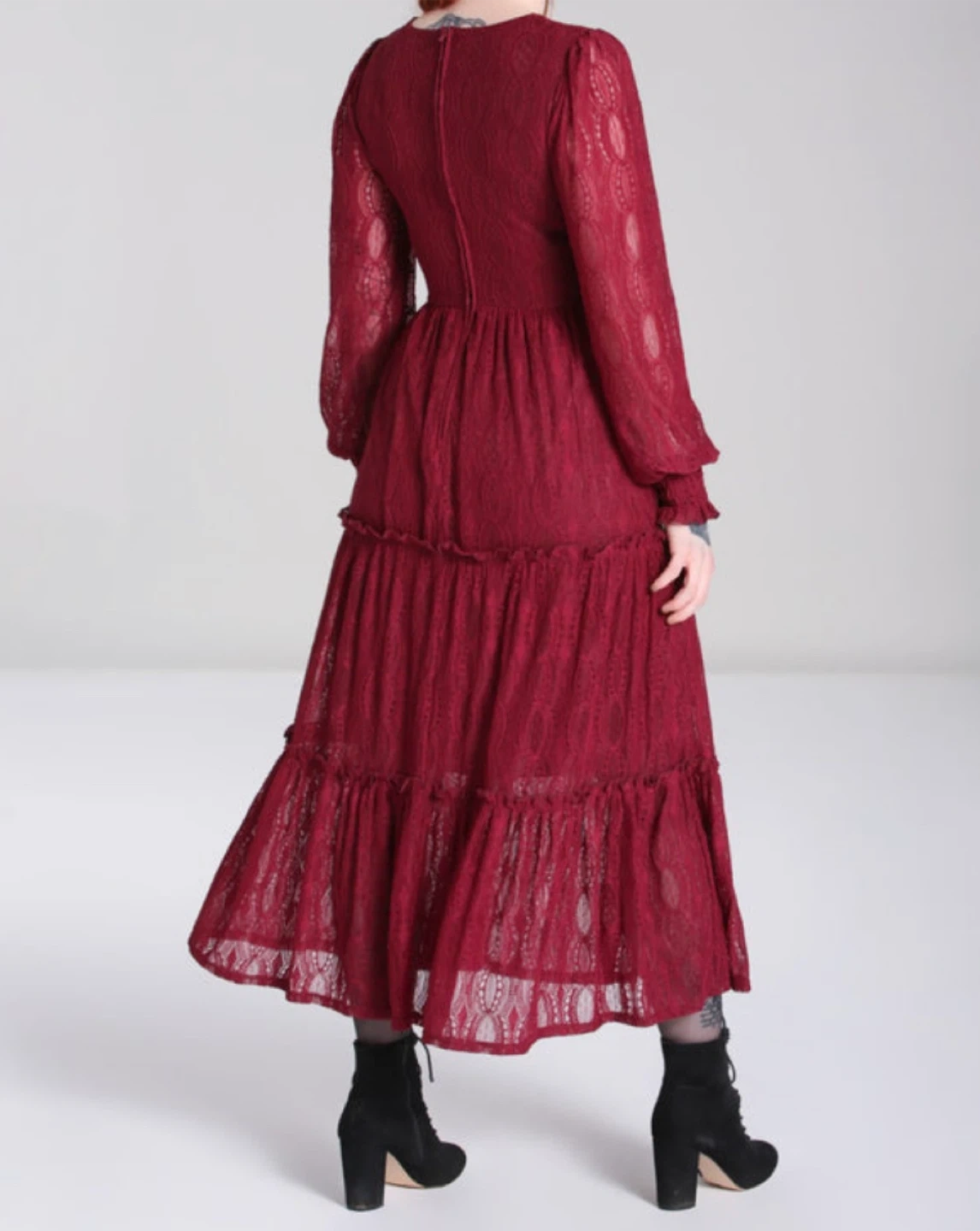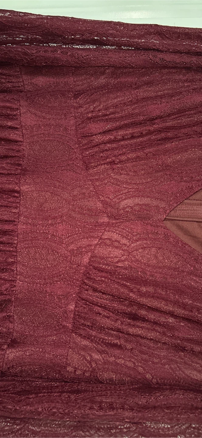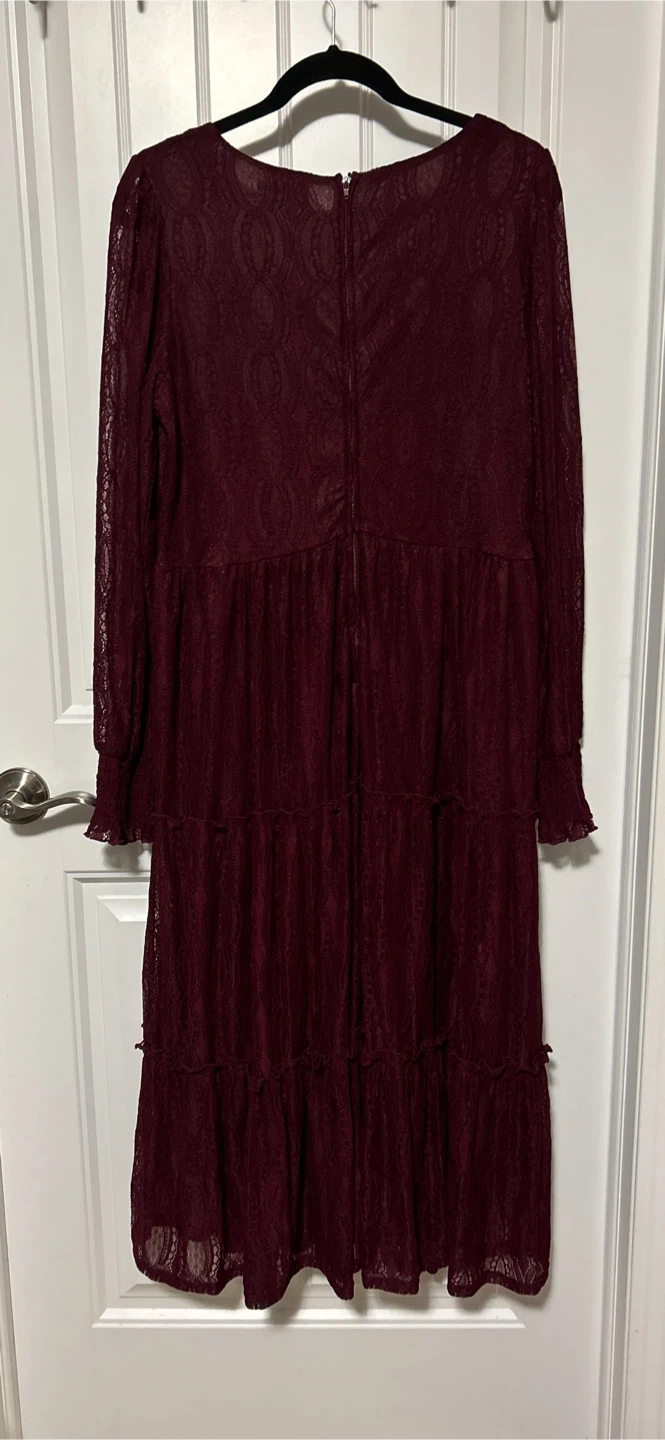 Hell Bunny Available! Beautiful burgundy lace dress from Hell Bunny - XL. The dress features a flirty V-neckline which gathers into the underbust seam to flatter your ‘girls’. Bodice is lined. Full-length puff sleeves gather into shirred cuffs with a dainty frill detail. Gathered layers from the waistline to create a skirt consisting of 3 tiers and frilly panels for even more volume and drama. Skirt lining is to the second skirt frill seam. Centre back zipper travelling mid dress to allow easy fitting. The material is 95% polyester and 5% elastane, so it has a bit of stretch for a comfortable fit! NWOT •Public meet up would be here at Shoppers; 2526 66th Street SW *Cash upon meeting please*
