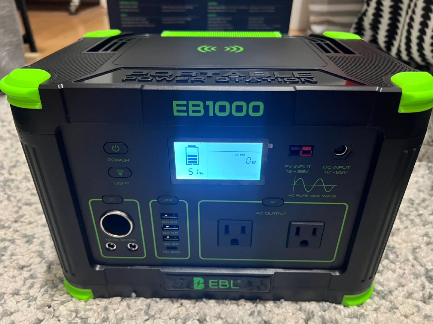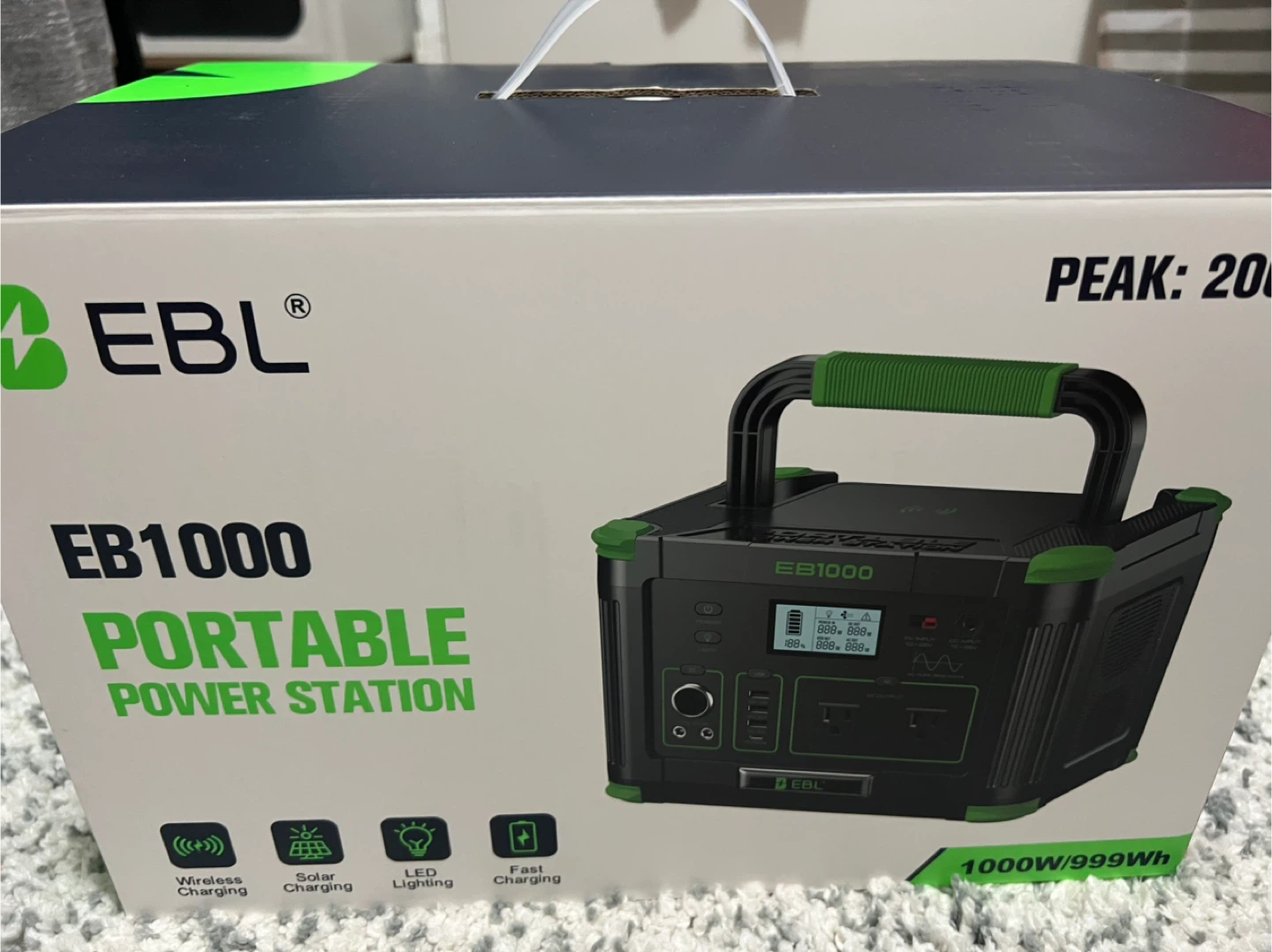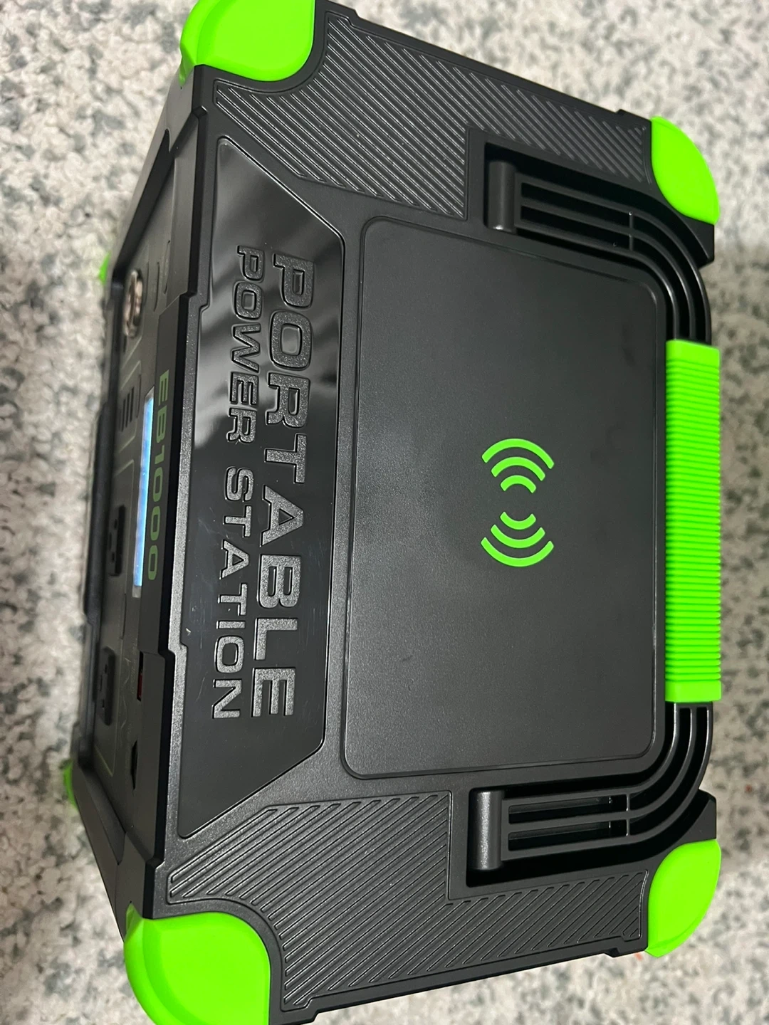 Selling an EB1000 portable power station. It's in new and comes with the original box. This power station features wireless charging, solar charging, LED lighting, and fast charging capabilities. It has a 1000W/999Wh capacity, making it perfect for outdoor adventures or emergency backup power