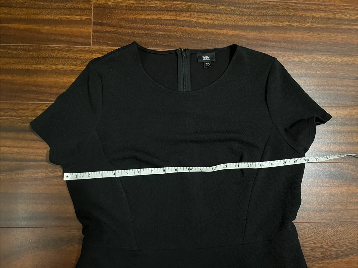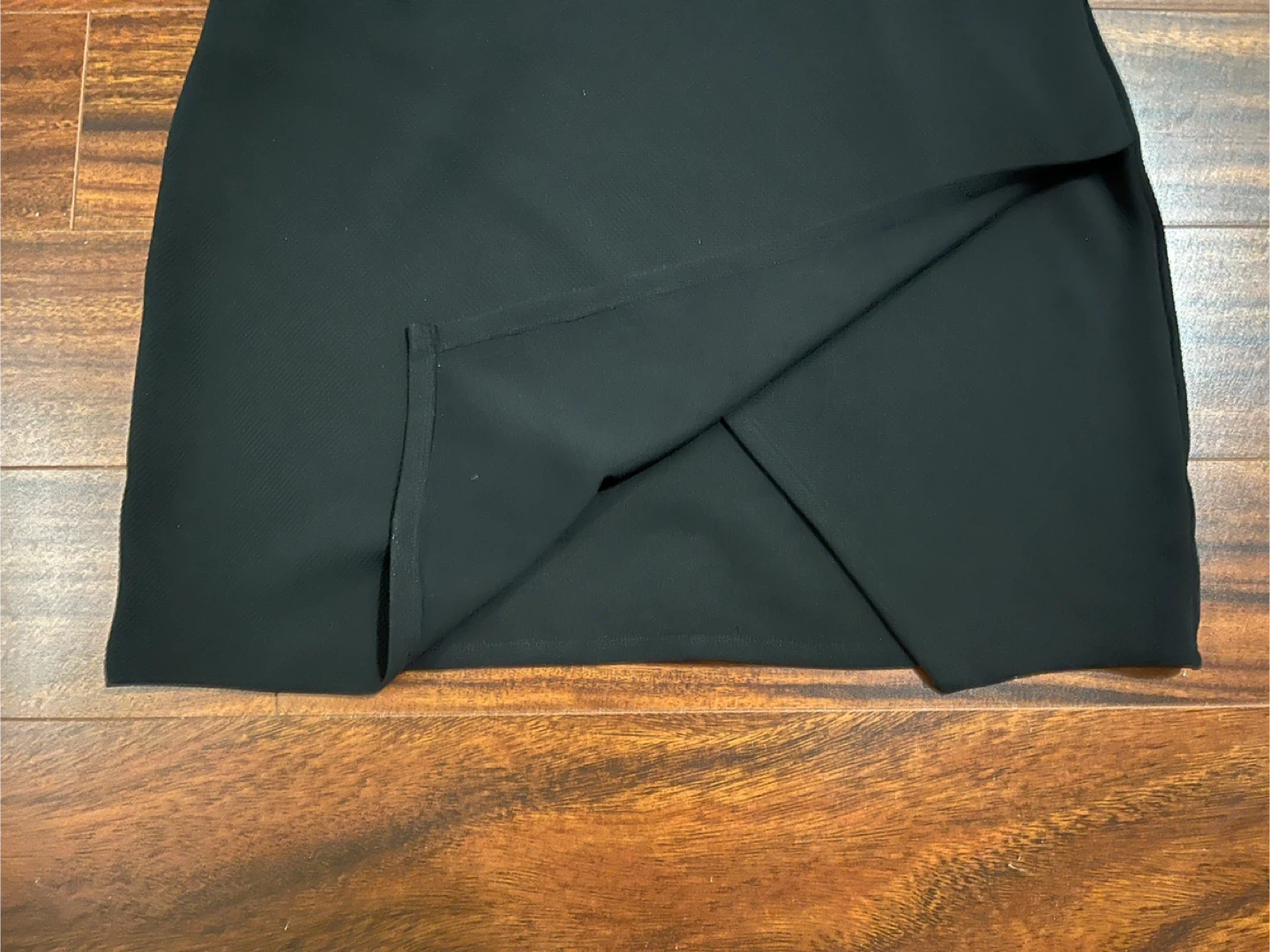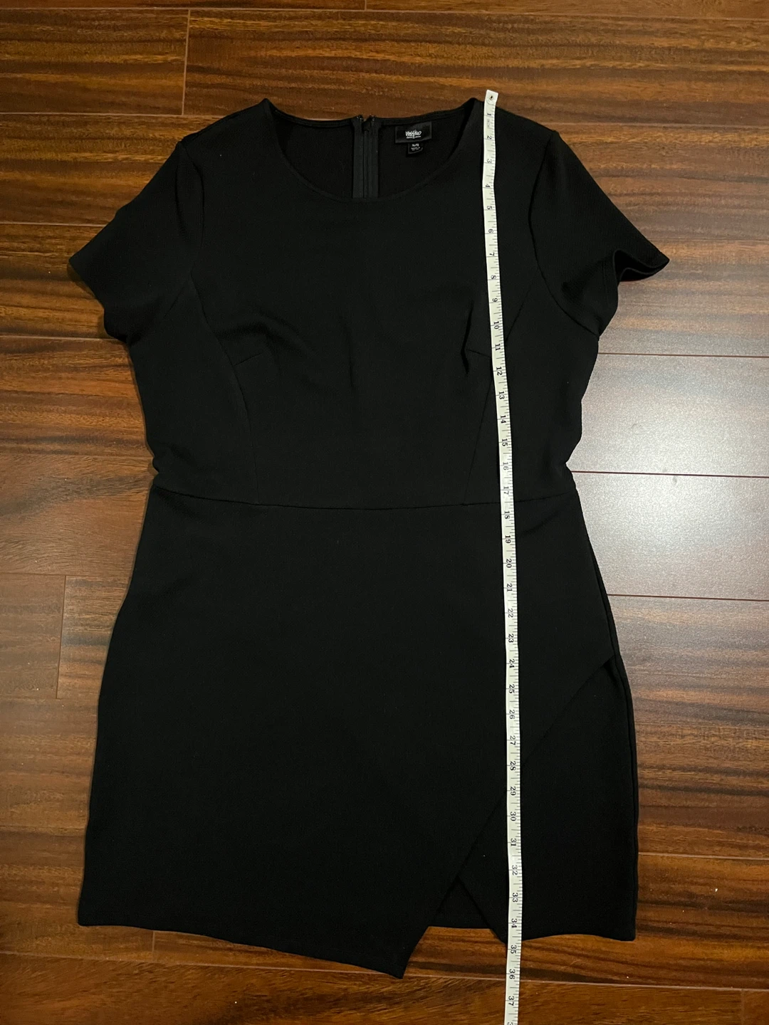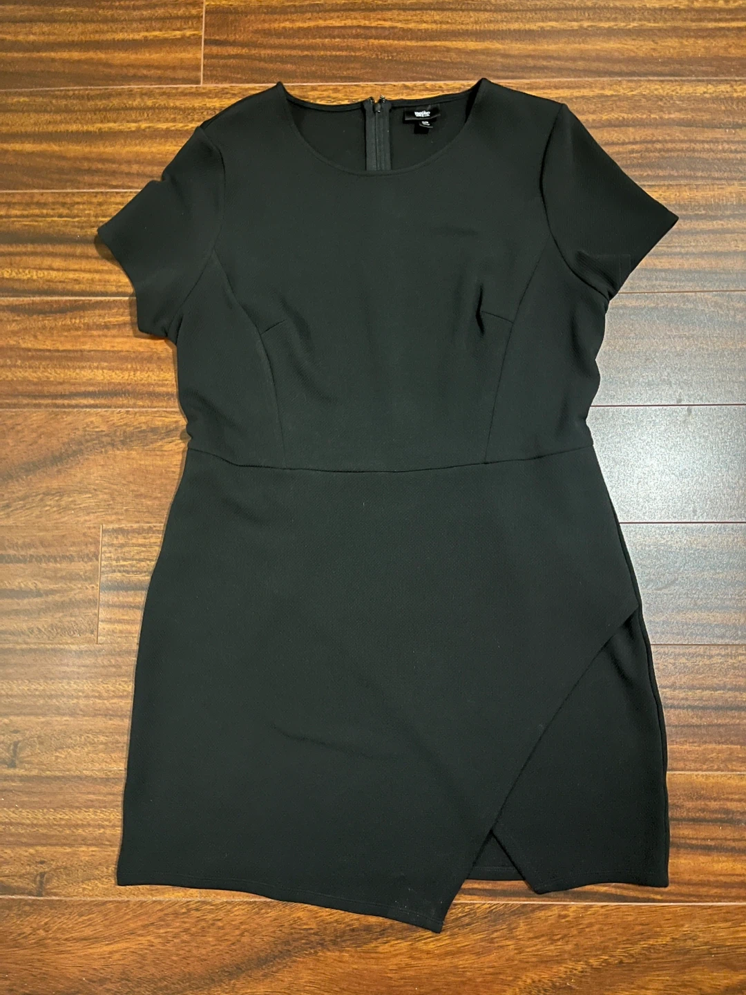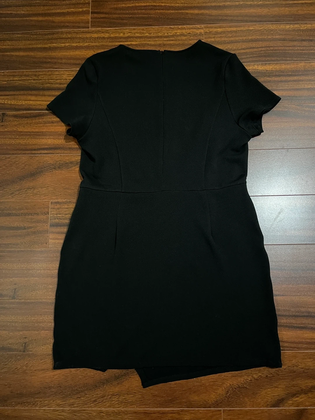 Women’s Mossimo extra large black dress with short sleeves and textured stretch fabric. The asymmetrical hem is created by overlapping front panels that cross and fall at different lengths for a clean angled finish. Excellent condition. Smoke free home.