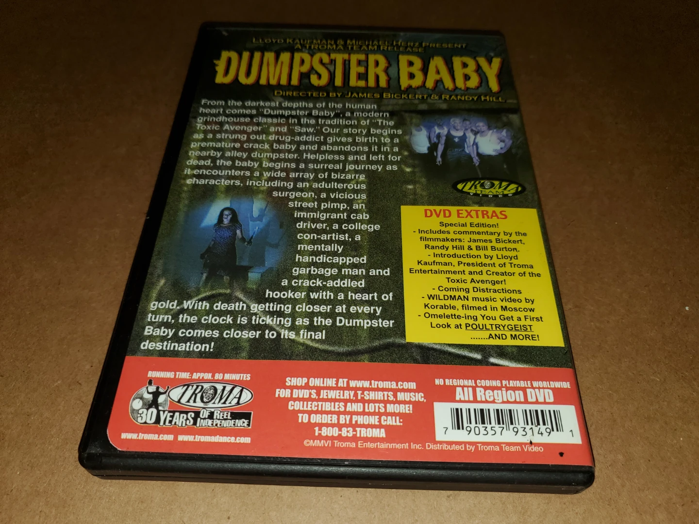 Selling a DVD copy of Dumpster Baby, a Troma Team release.
