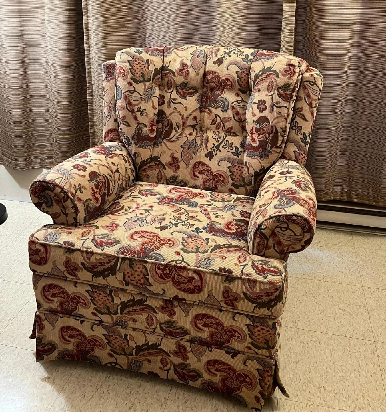 Selling a cozy armchair with a lovely floral pattern. It's perfect for adding a touch of charm to any room. The chair features rolled arms and a comfortable seat, making it a great spot to relax and unwind