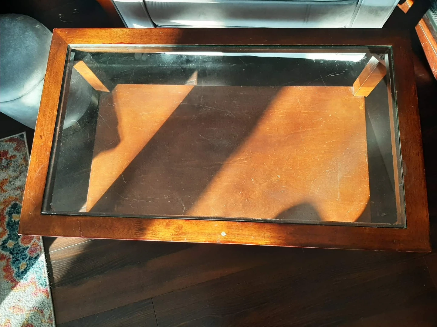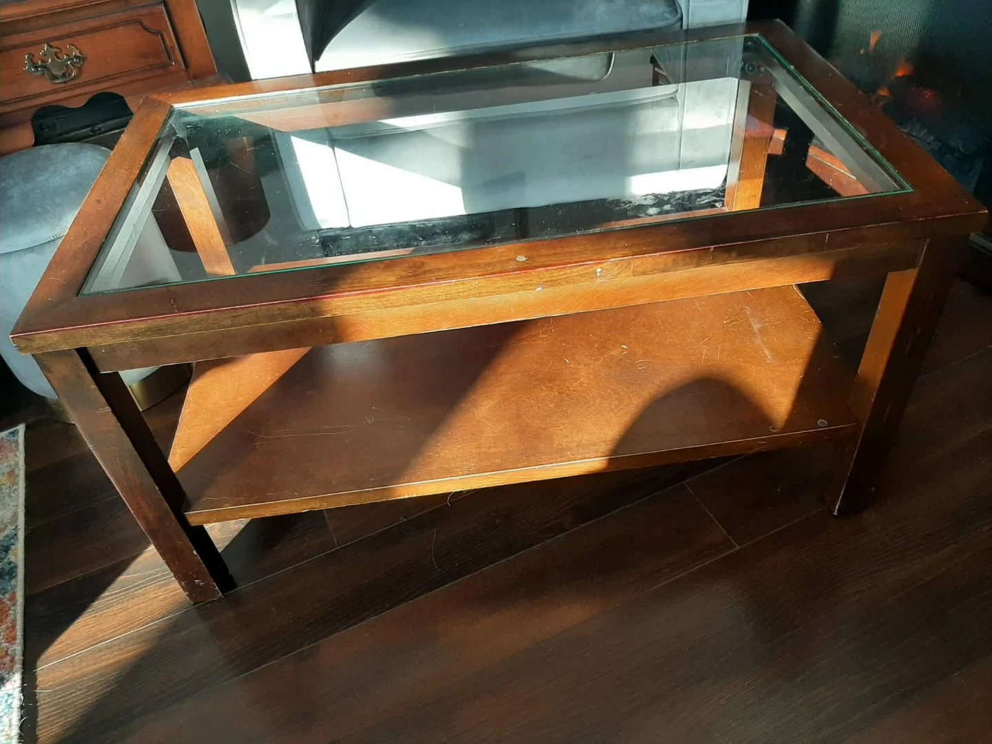 A wood coffee table with a glass top. It has a lower shelf for storage or display. Perfect for any living room! Buyer responsible for pickup. No delivery.