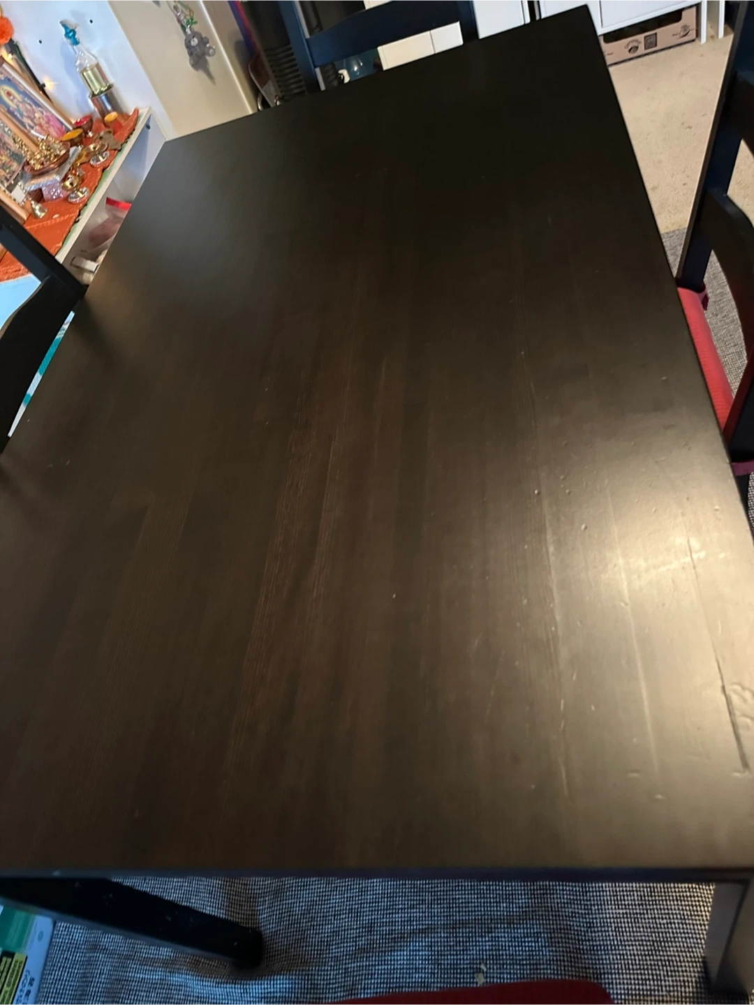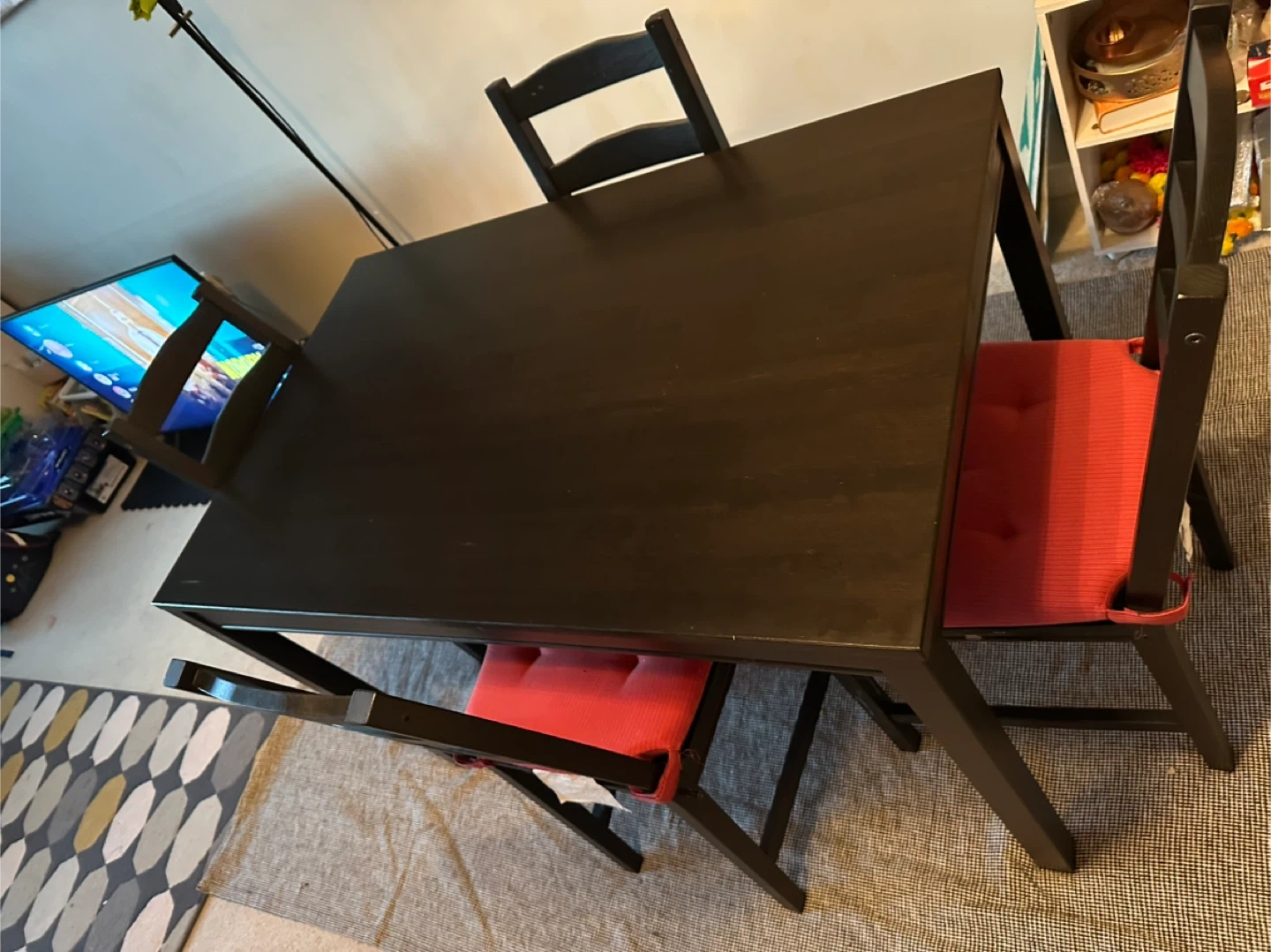 Selling a dining table with four chairs! The table is a dark colour and comes with four chairs with red cushions.