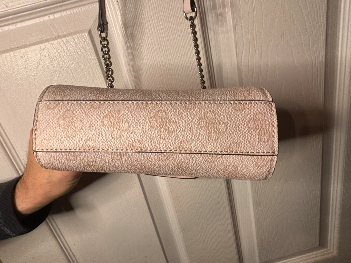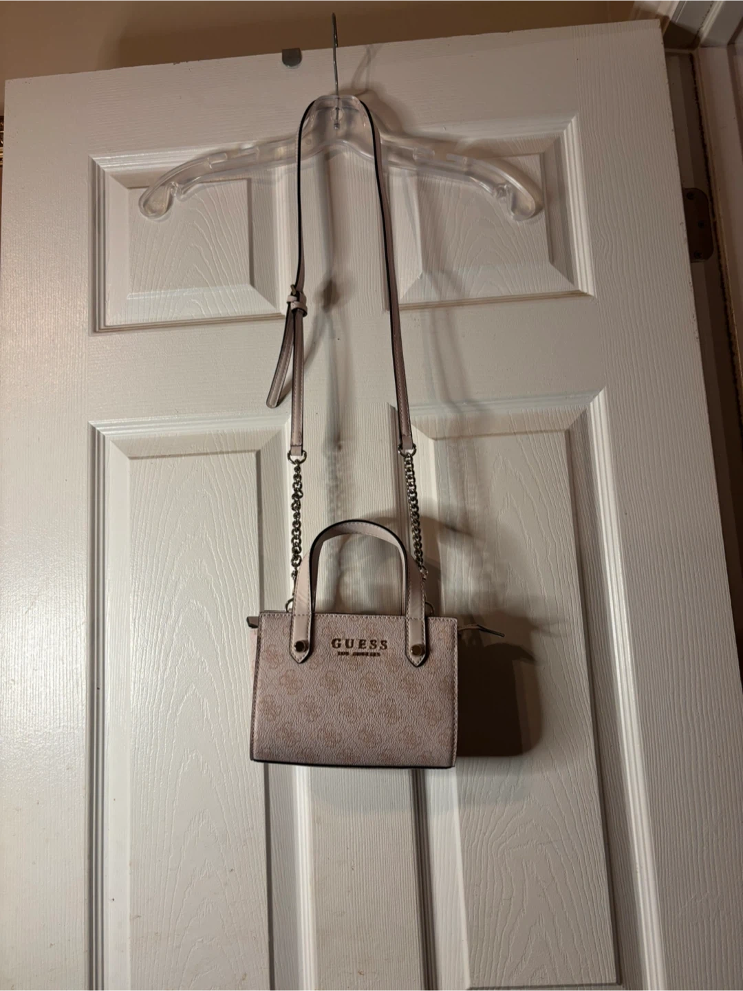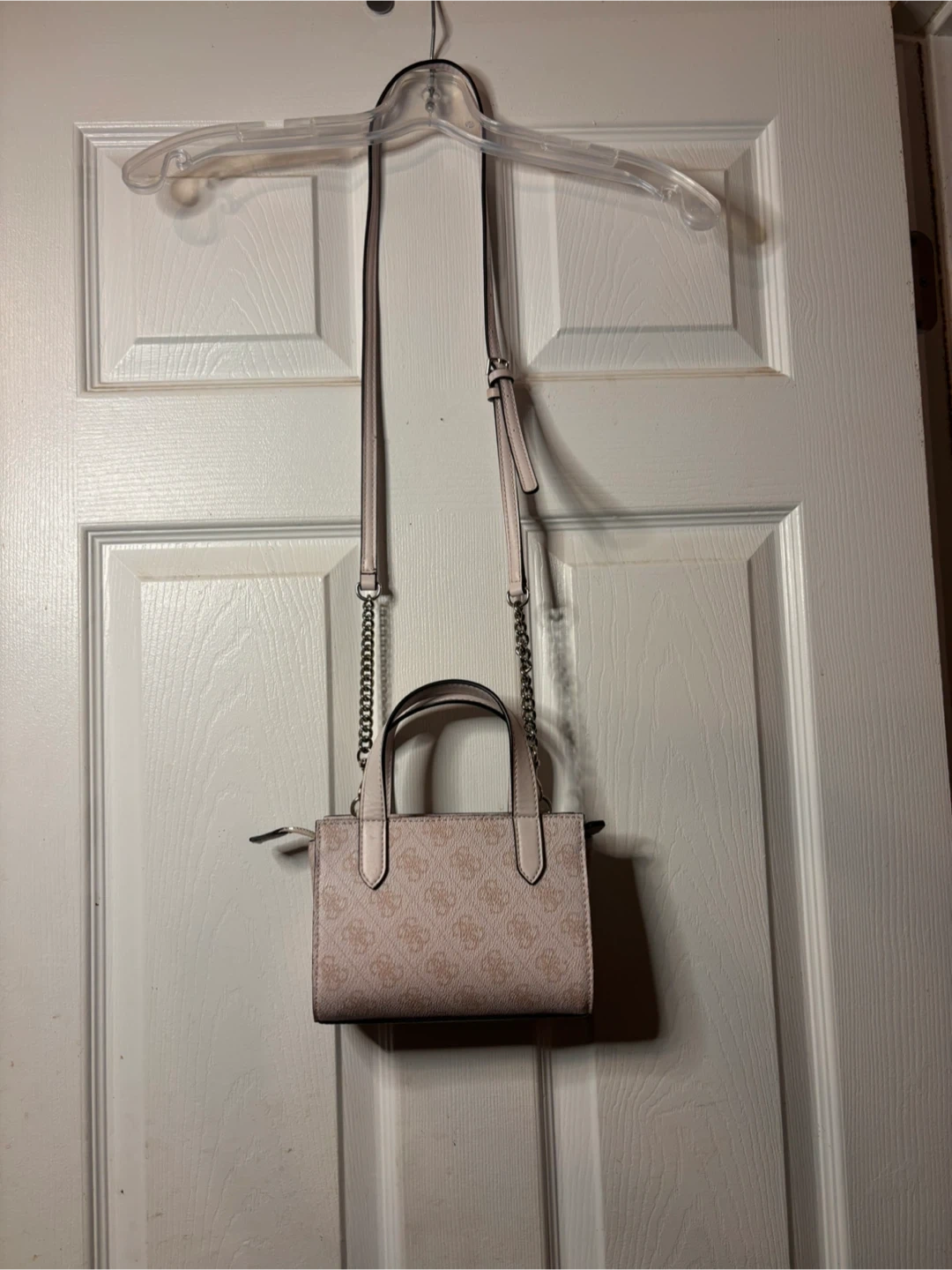 $35 or best offer - Chic and versatile GUESS mini satchel in a soft blush logo print with gold-tone hardware. This bag features both structured top handles and a removable crossbody strap, making it perfect for everyday wear or a night out. Compact yet roomy enough for your phone, wallet, keys, and essentials.