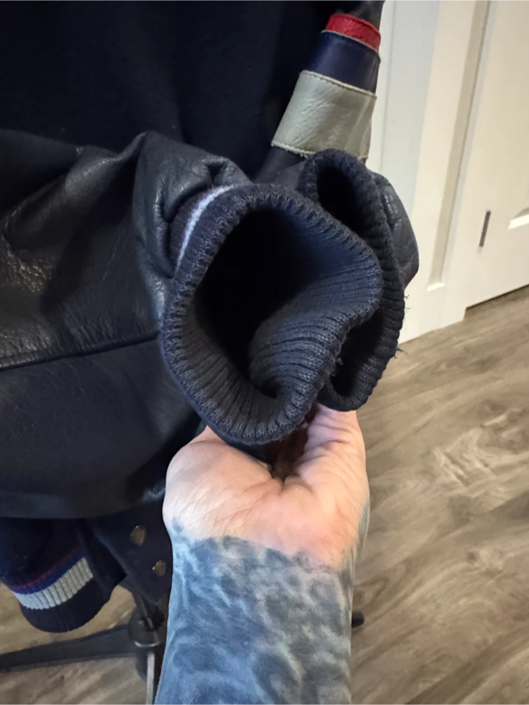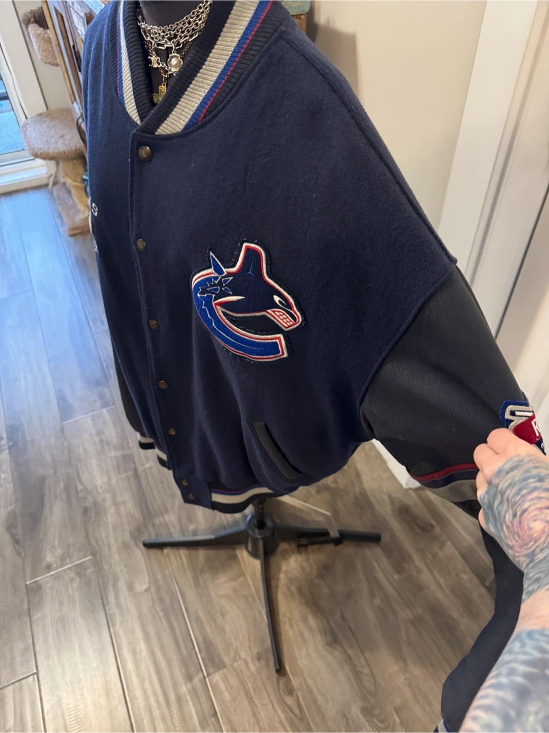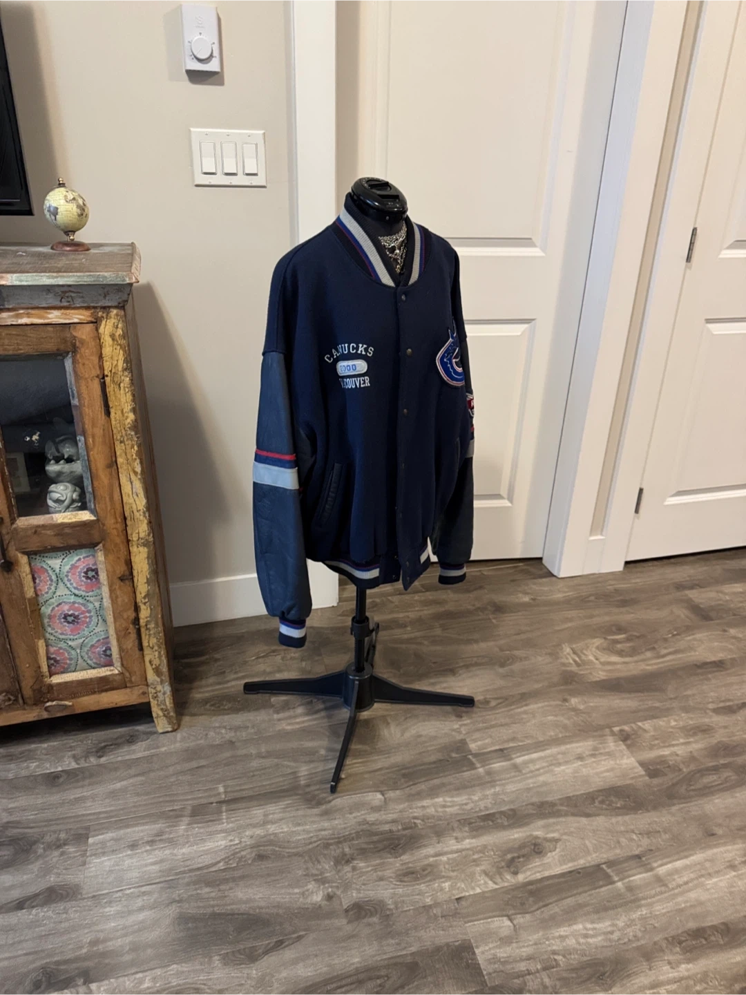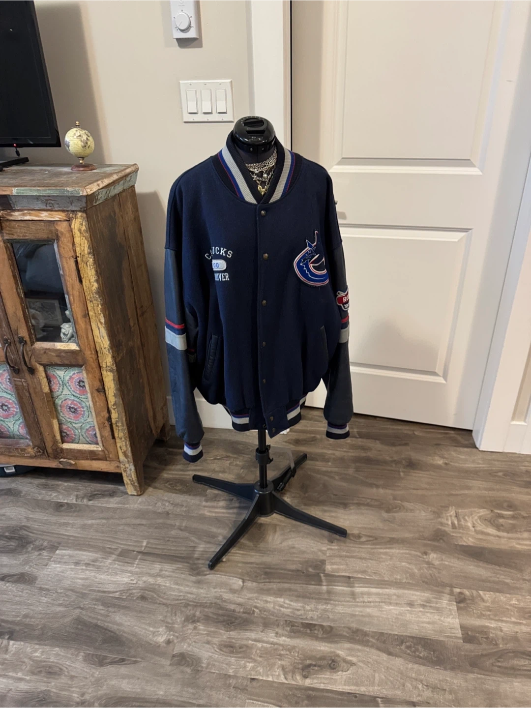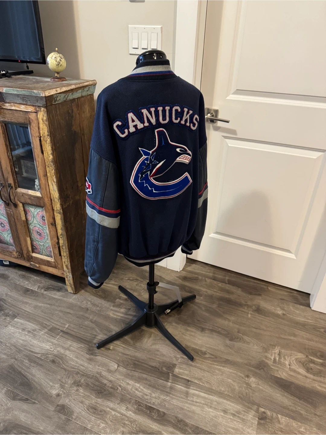 From 2000 so as is wear, small fray holes by collar & hem & under arm but mended. Minor fuzz. Leather sleeves & leather pocket trim. One inner pocket. Super cool vintage collectors piece. Stylish Canucks varsity jacket in navy blue. Features bold logo on the back. Offical NHL product