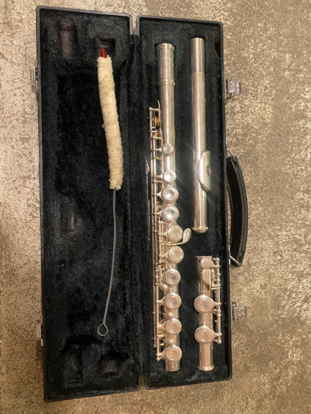 Selling a Yamaha flute that comes with its case! The flute appears to be in good condition and includes a cleaning rod. About 15 years old but great working condition.