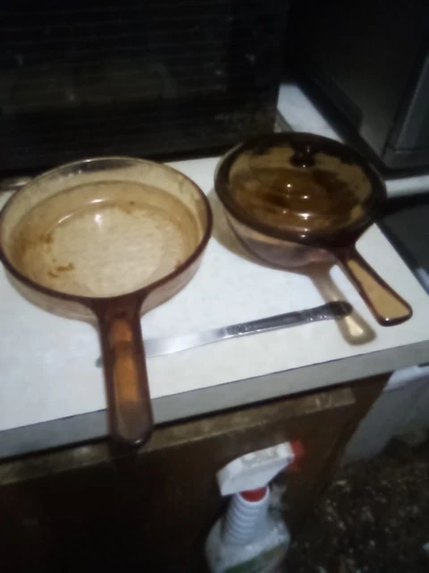 Selling a vintage Vision amber glass cookware set. It includes a saucepan and a lid. This cookware is known for its durability and unique design!