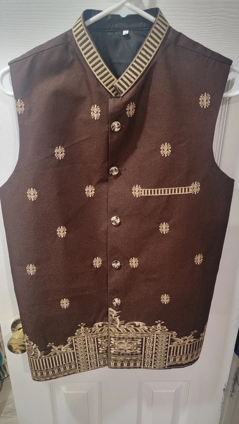 Here's a nice brown vest with gold embroidery. It has a V-neck and button-up closure. Perfect for adding a touch of elegance to any outfit