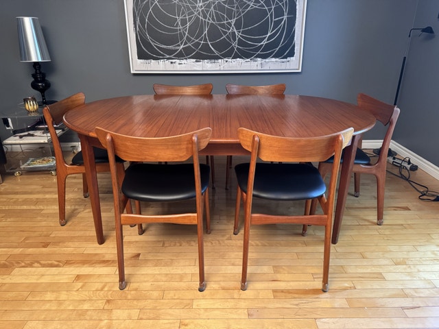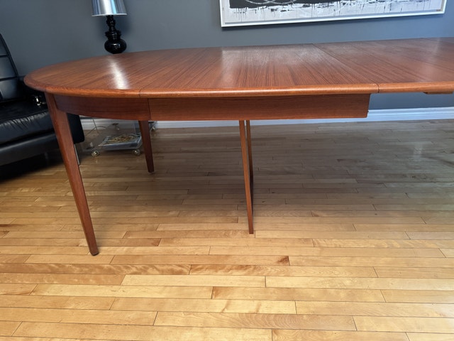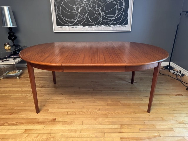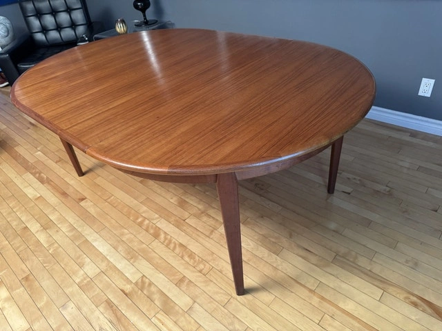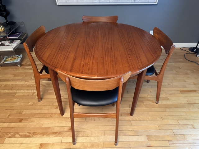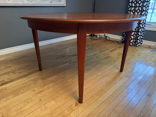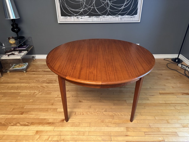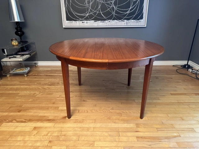 MCM Danish Teak dining table features a round design that expands, measuring 48 inches in diameter and 29 inches in height, perfect for adding a touch of vintage elegance to your dining space. The table is used but in good condition, ready to be the centrepiece of your dining room. Here are some additional specifications: