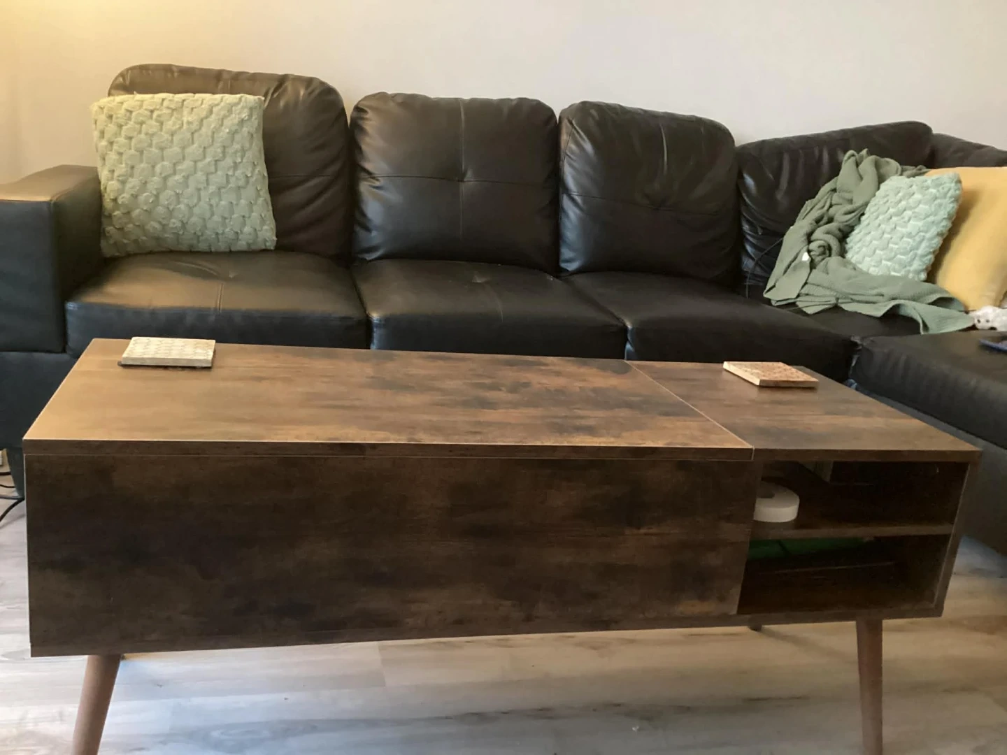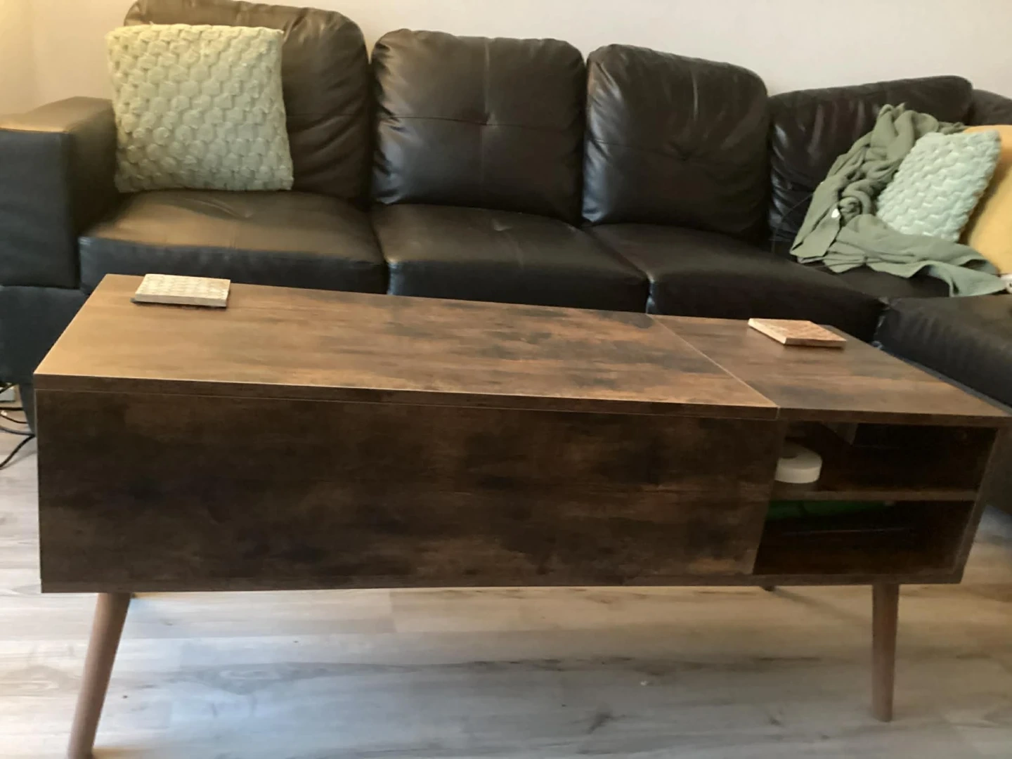 Selling a lift-top coffee table in a rustic brown finish. It features a hidden compartment for storage and a side shelf for added convenience. The table's dimensions are approximately 26 inches in length, 19.7 inches in width, and 16.3 inches in height. Perfect for small spaces and multi-functional living!