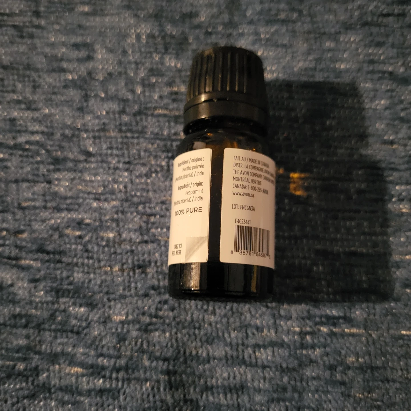 Selling a bottle of Avon Pure peppermint essential oil. It's a 10 ml (.34 fl. oz. US) bottle of 100% pure menthe poivree/peppermint oil. Made in Canada