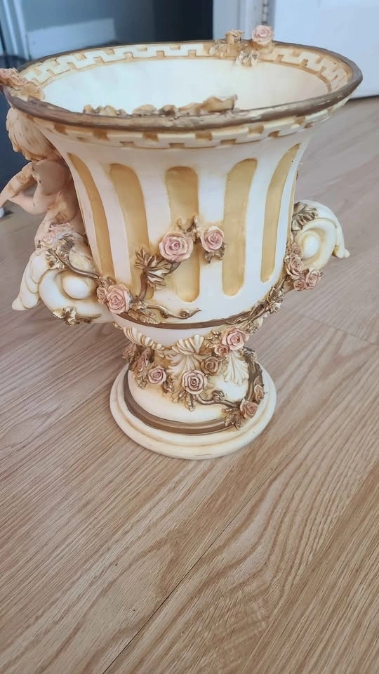 Decorative vase with two musical angels and pink roses.