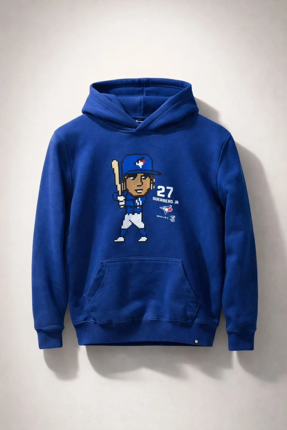 Show your Blue Jays pride with this Champion hoodie featuring Vladimir Guerrero Jr! The hoodie is a vibrant blue and has a cool pixelated design of Guerrero Jr. on the front. Perfect for any Jays fan!