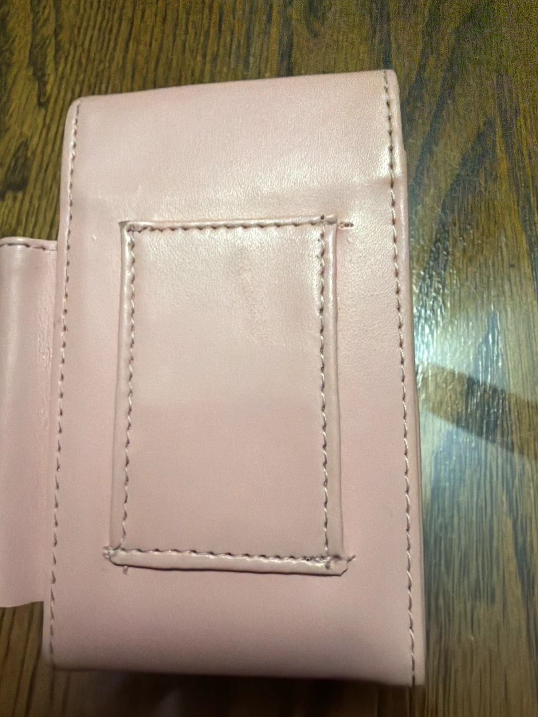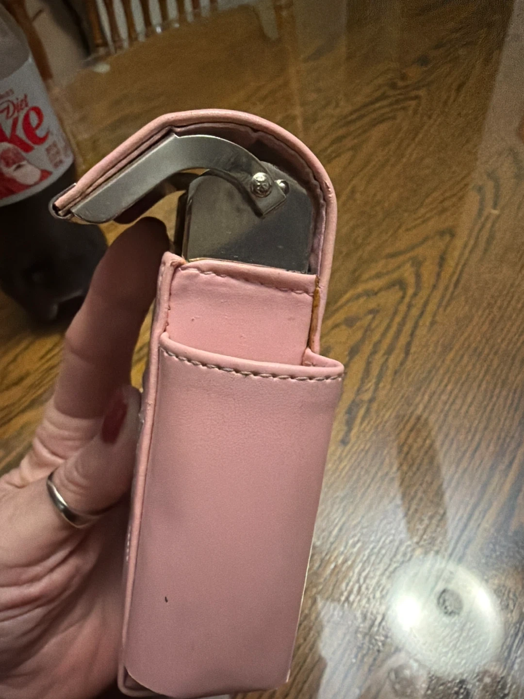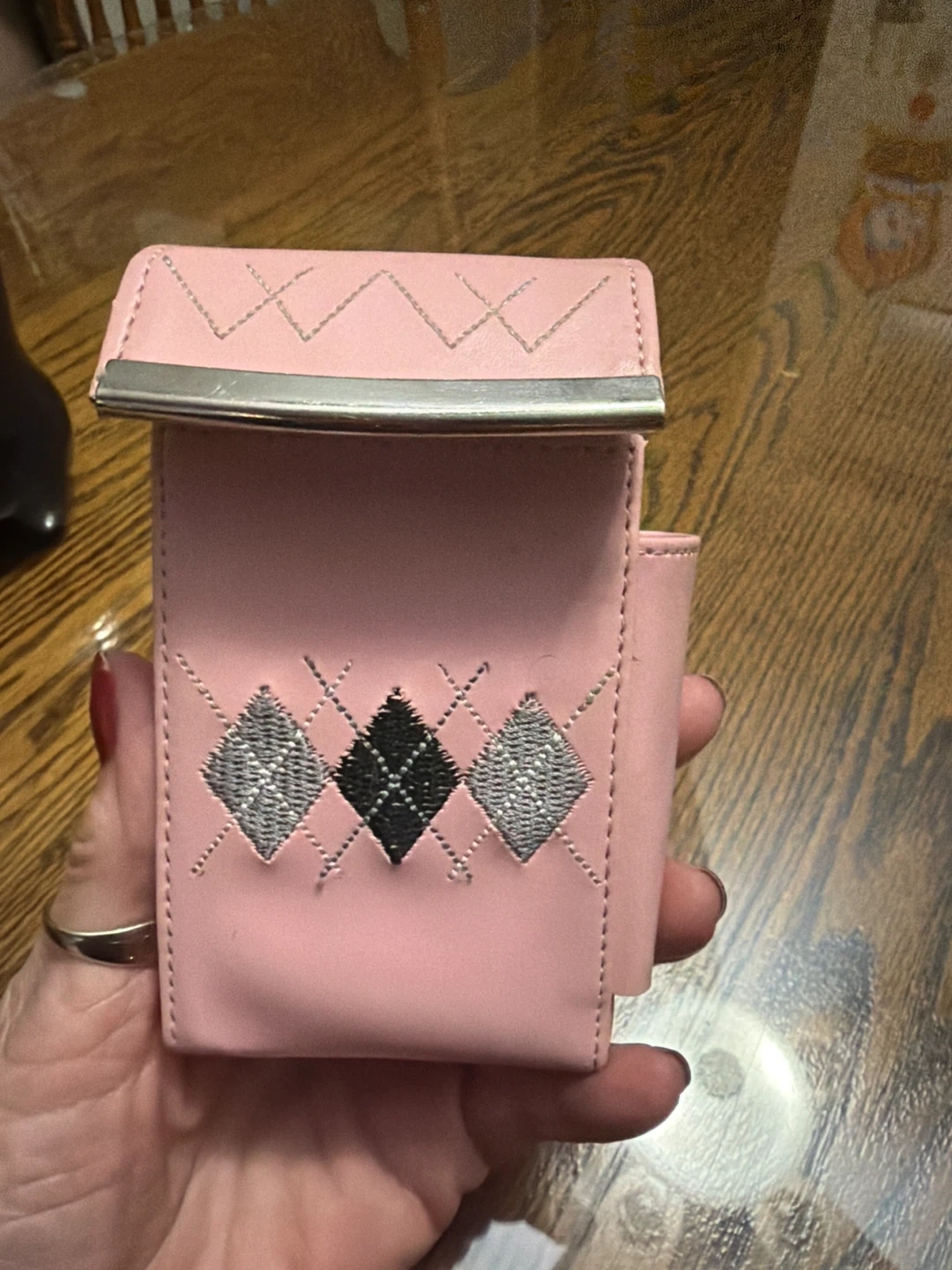 Selling a cute pink cigarette case. It has a metal clasp and a pocket on the front. The back features a square design, and the front has an argyle pattern. Perfect for keeping your cigarettes safe and stylish