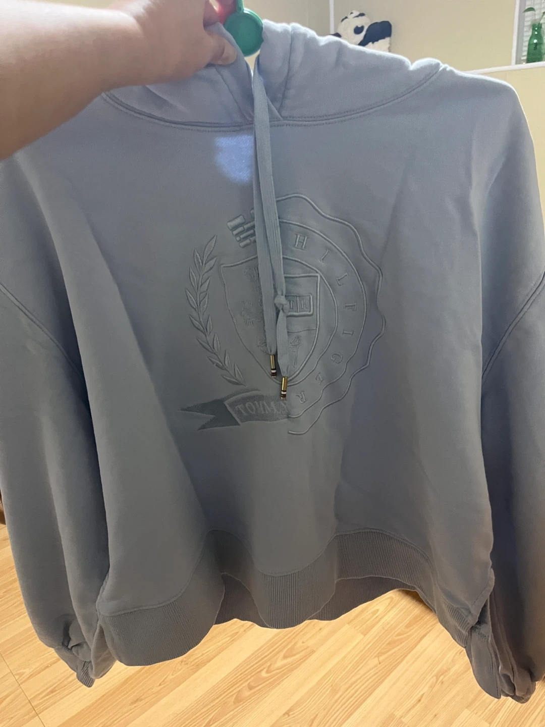 Tommy Hilfiger hoodie in a light blue colour! It's a size medium and in great condition. Perfect for layering or just lounging around