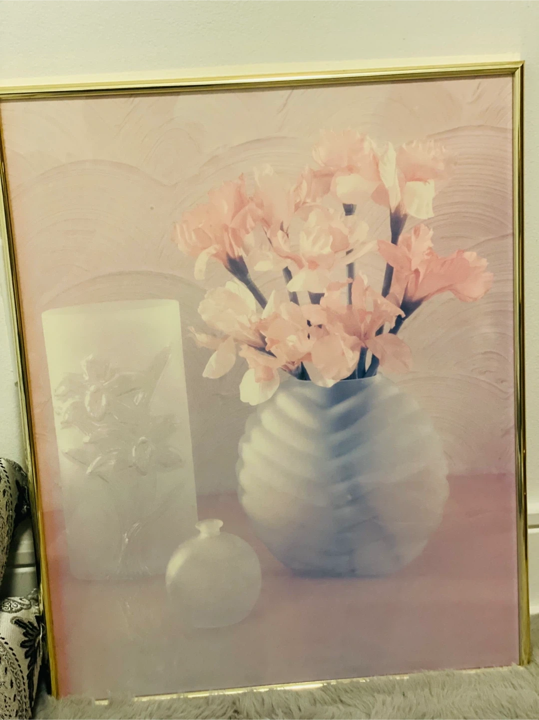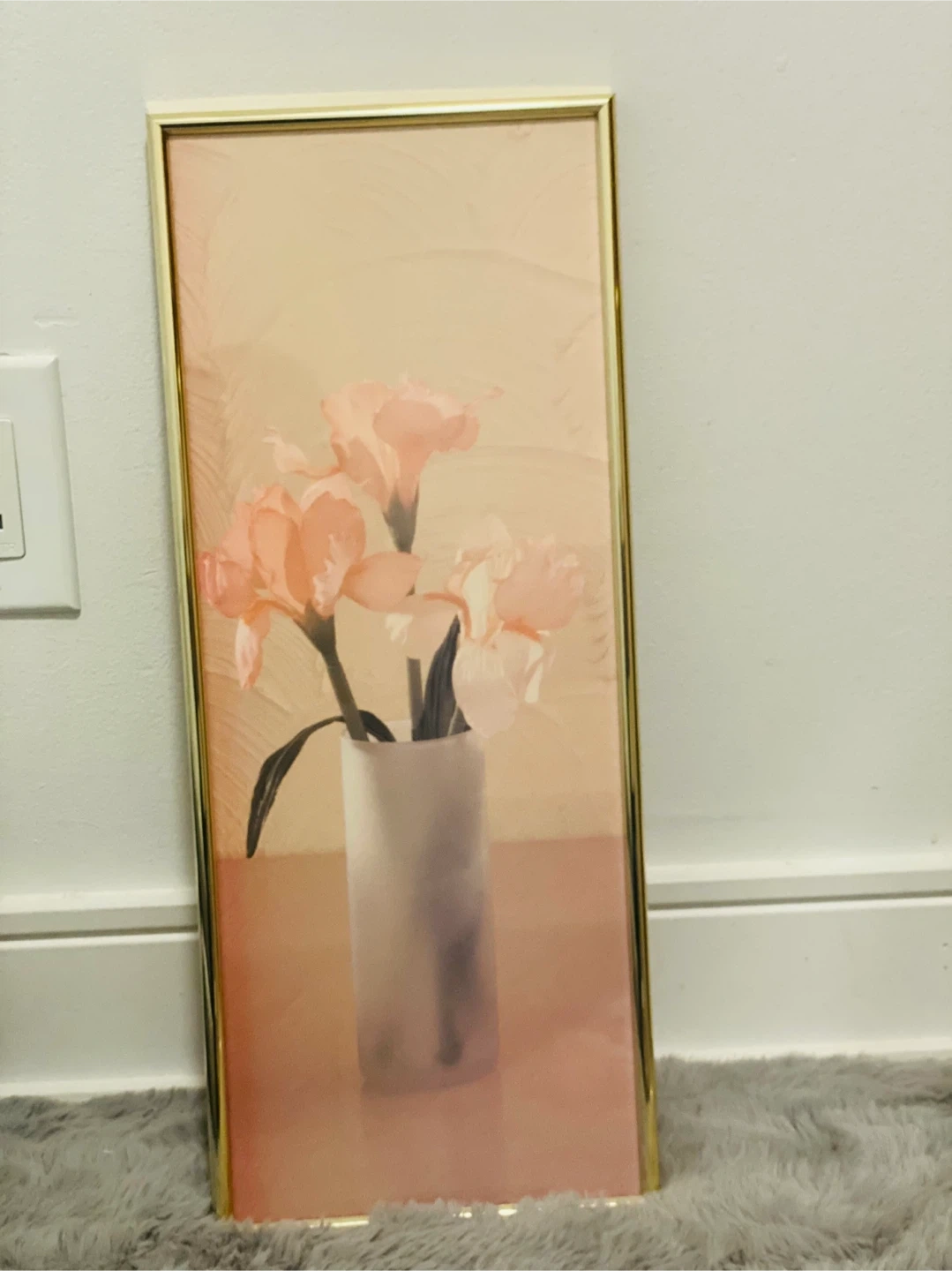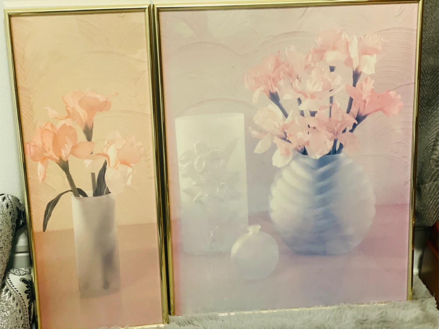 Selling a pair of framed floral still life prints. They feature a soft, muted colour palette with gold frames. These prints would add a touch of elegance to any room!