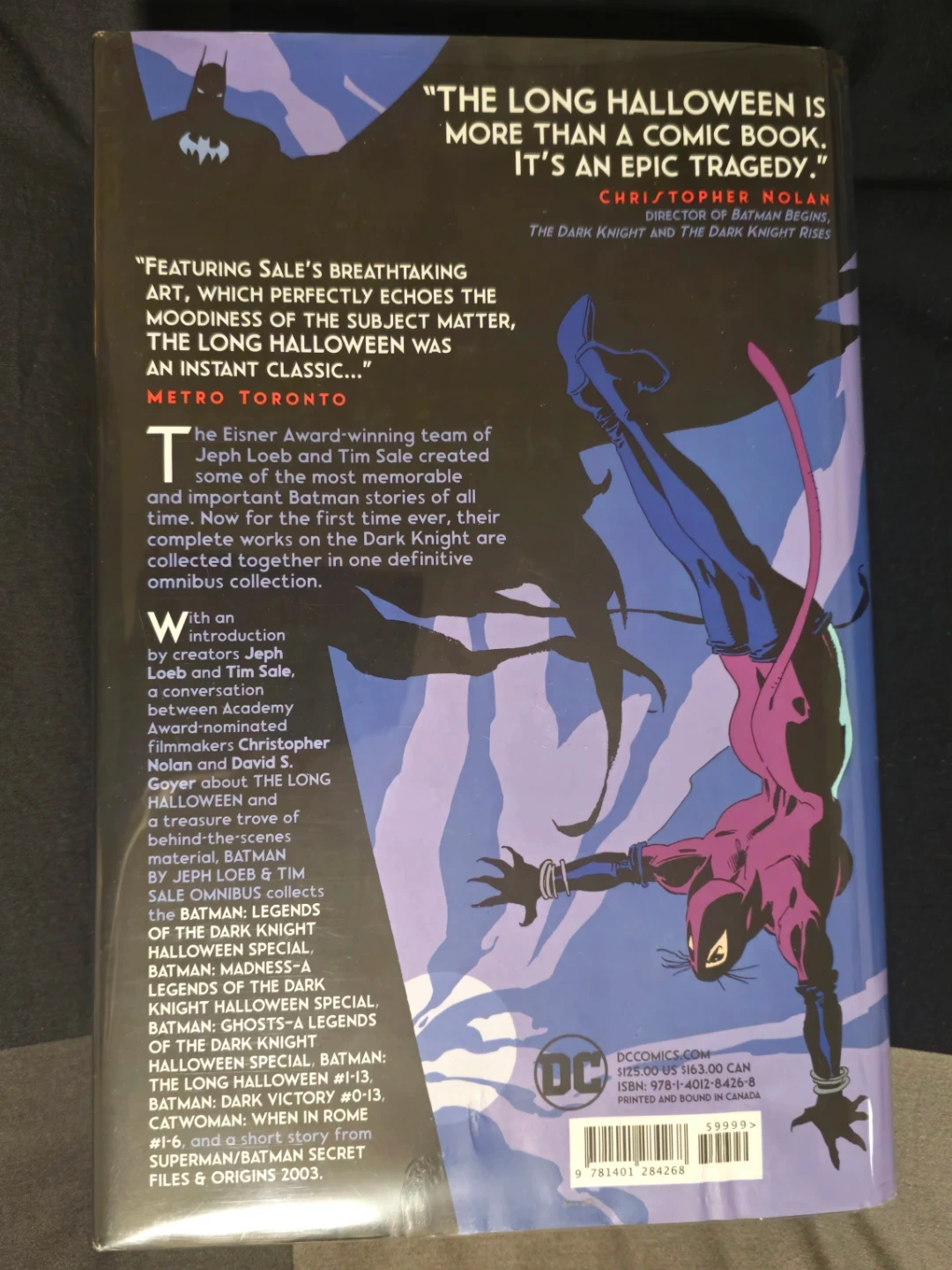 Batman by Jeph Loeb and Tim Sale Omnibus for sale. Collects The Long Halloween, Haunted Knight, Darkest Victory and Catwoman: When in Rome. Excellent condition, slipcover was kept in a clear plastic cover, smoke free home. Slight laminate blemish on front as seen in first Pic, but cover is still crisp.