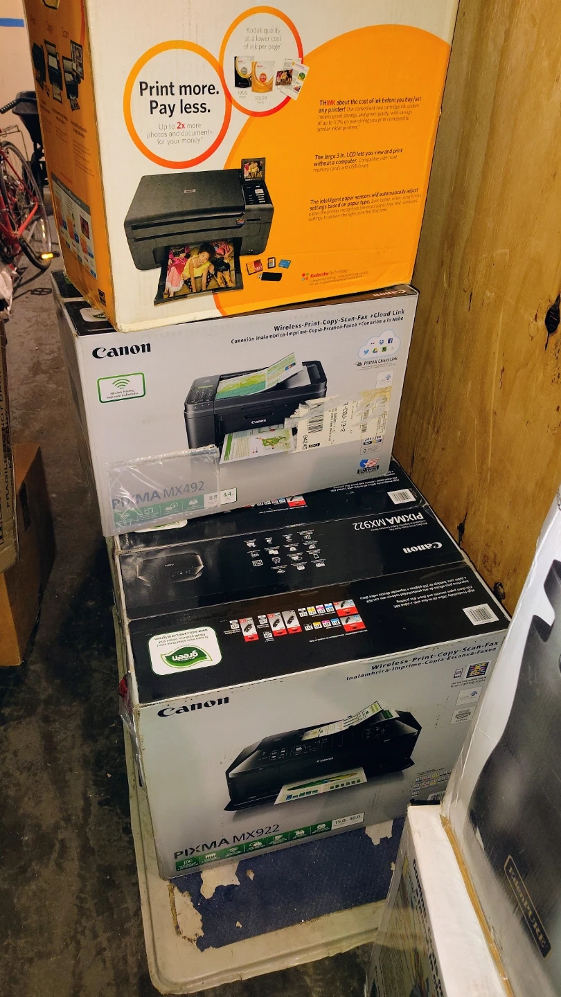 Selling a few printers that are still in their boxes! There is a Canon PIXMA MX922, a Canon PIXMA MX492, and a Kodak ESP-5.