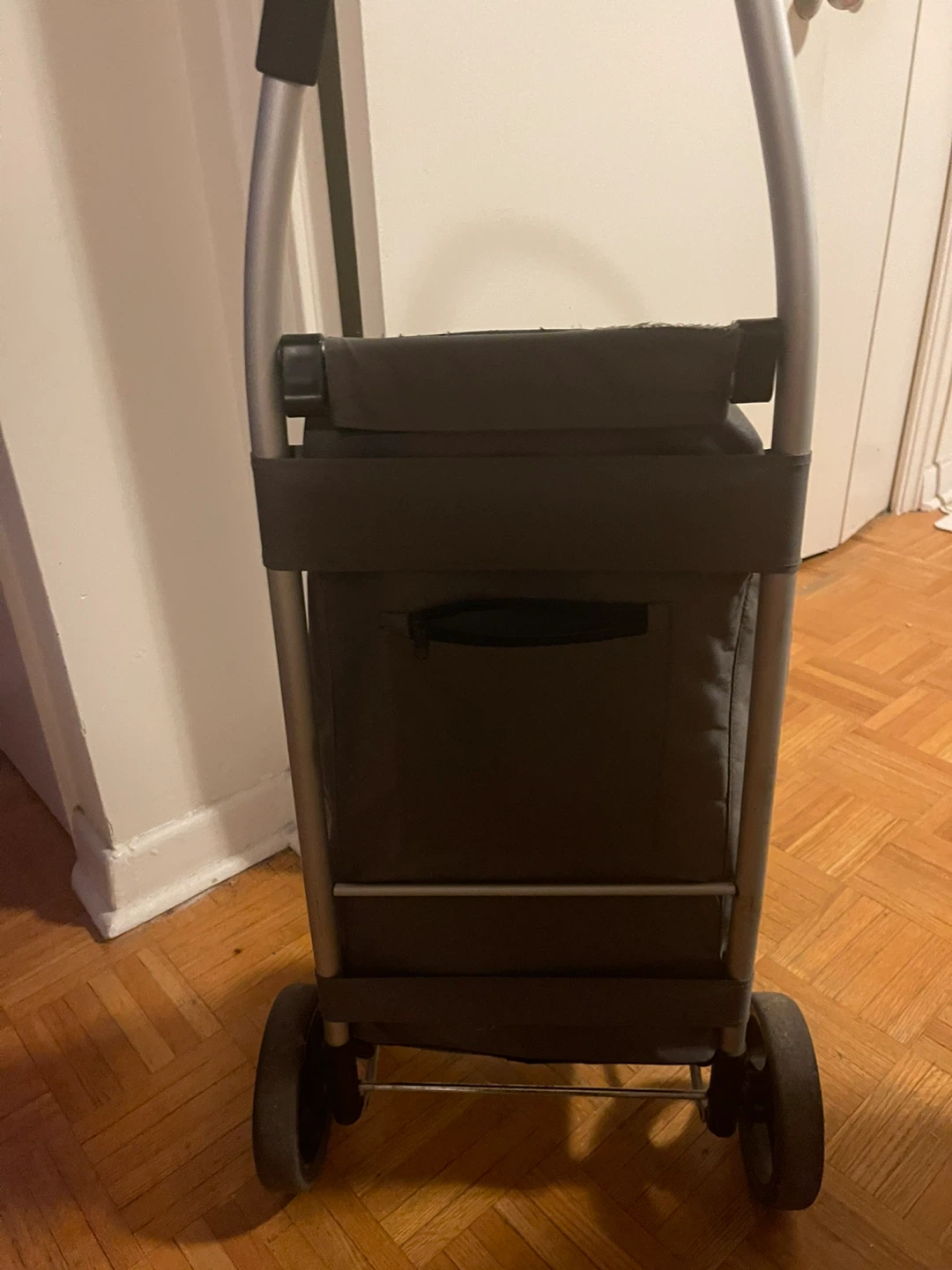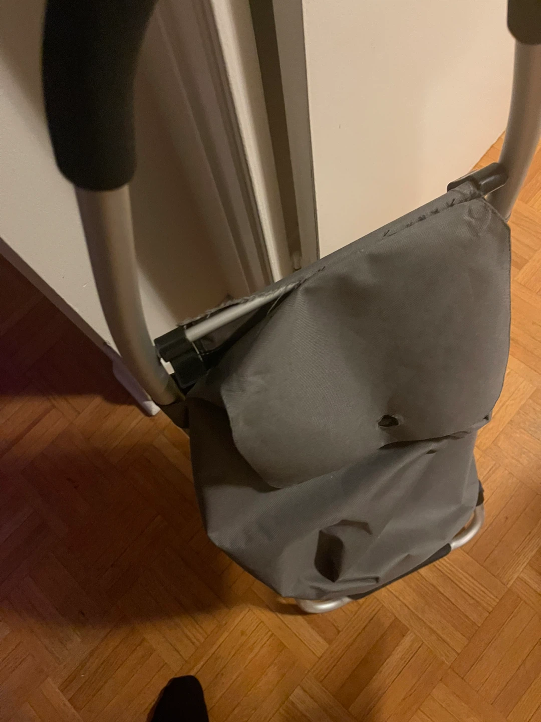 Free grey shopping cart. It could use a few stitches at the shoe repair shop, but is otherwise in good condition and ready to help you with groceries or other errands.