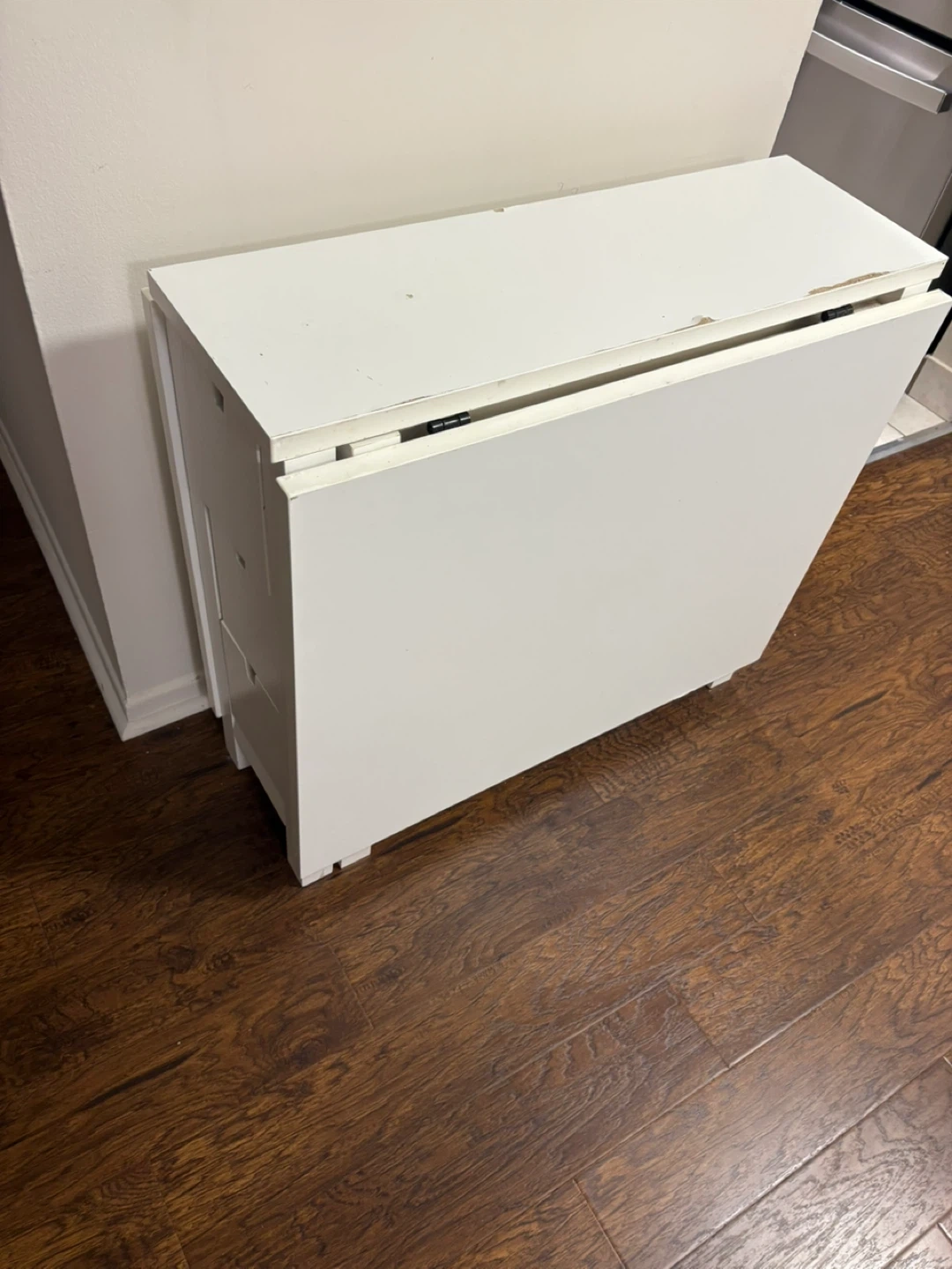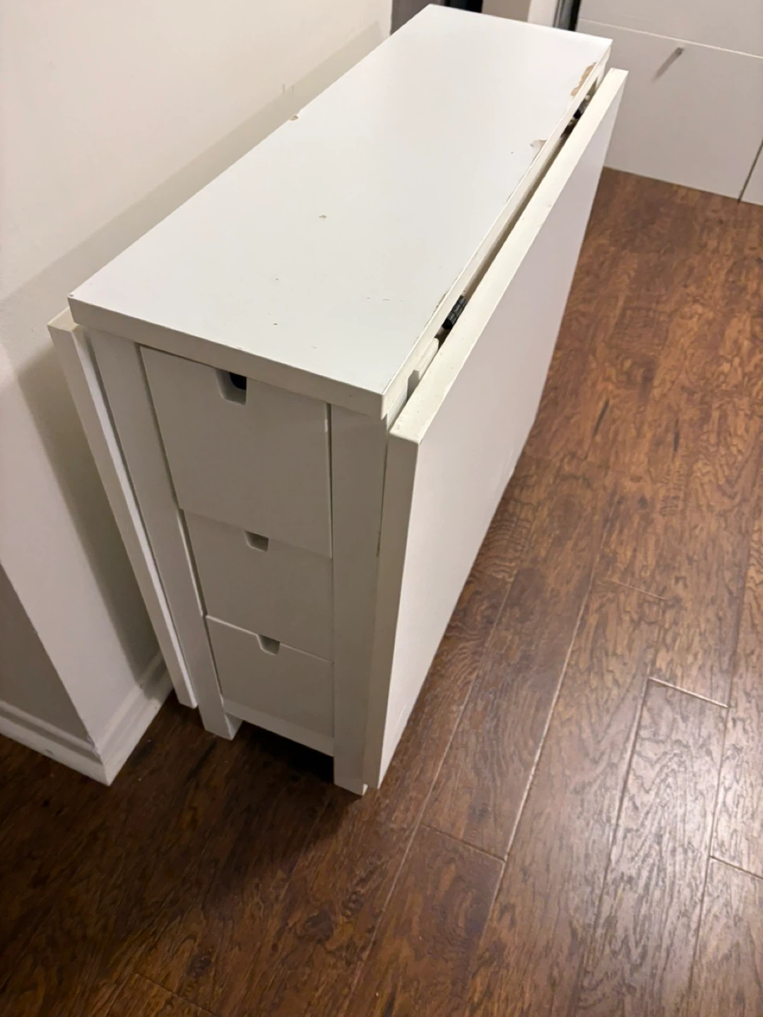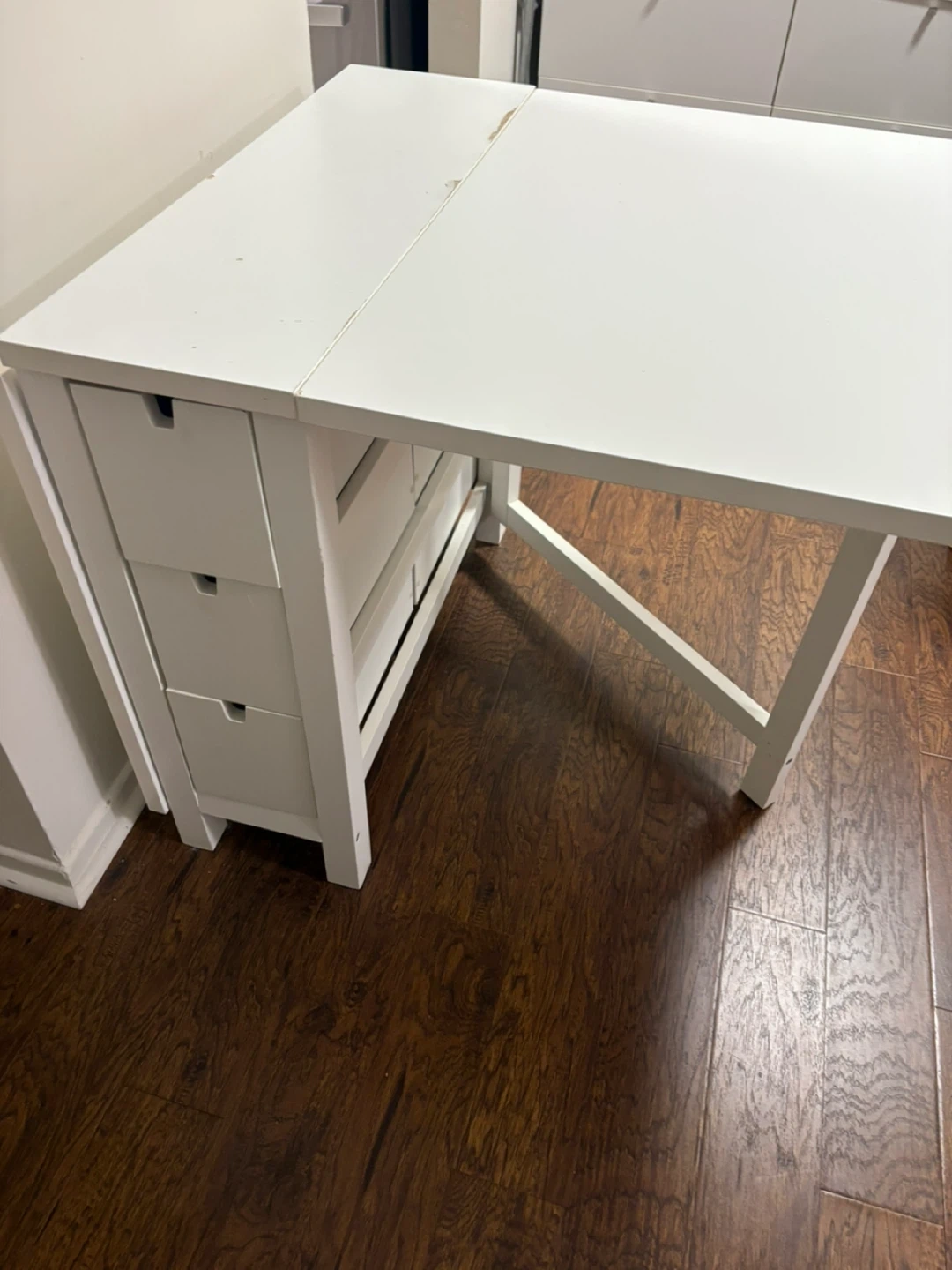 Selling a white IKEA Norden extendable drop leaf table. It’s perfect for small spaces and can be adjusted to different sizes as needed. There are some signs of wear and tear on the top middle as shown in the photos, but it's still very functional and sturdy! You can always cover that part with a runner Both sides come up