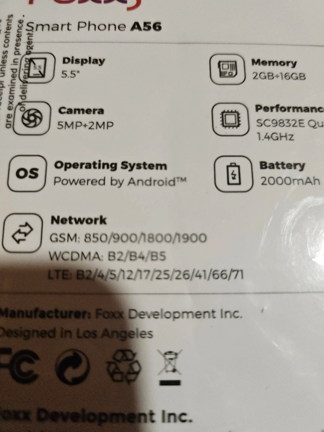 Selling a brand new Foxx Smart Phone A56! It has a 5.5" display, 2GB+16GB memory, and a 5MP+2MP camera. Runs on Android and has a 2000mAh battery. Never been used and comes in the original box