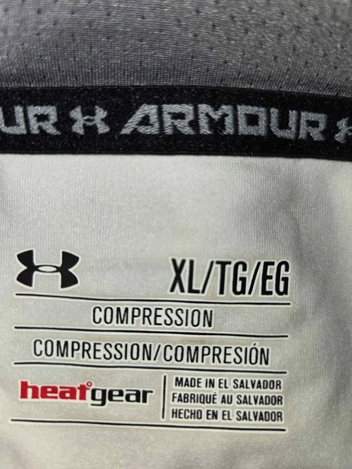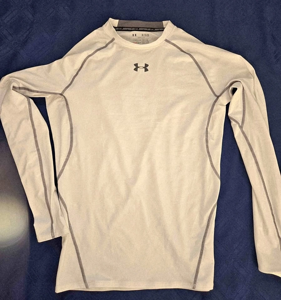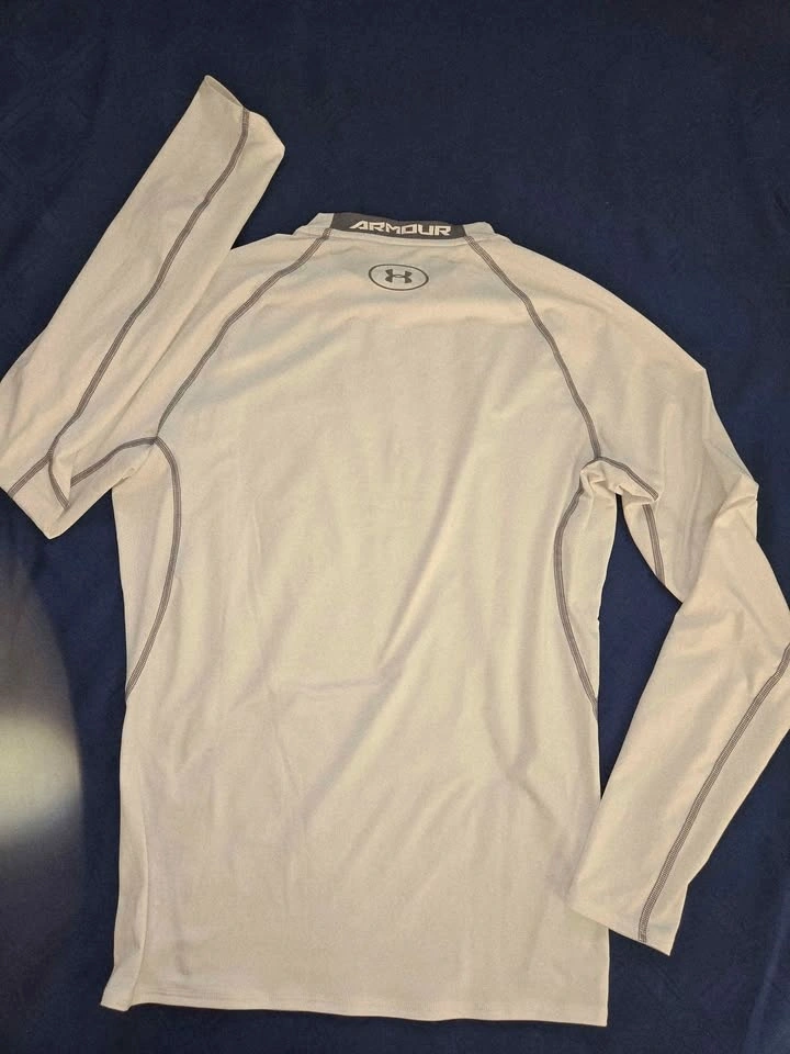 White Under Armour Men's HeatGear compression shirt. Breathable mesh underarms. Contrasting topstitching.